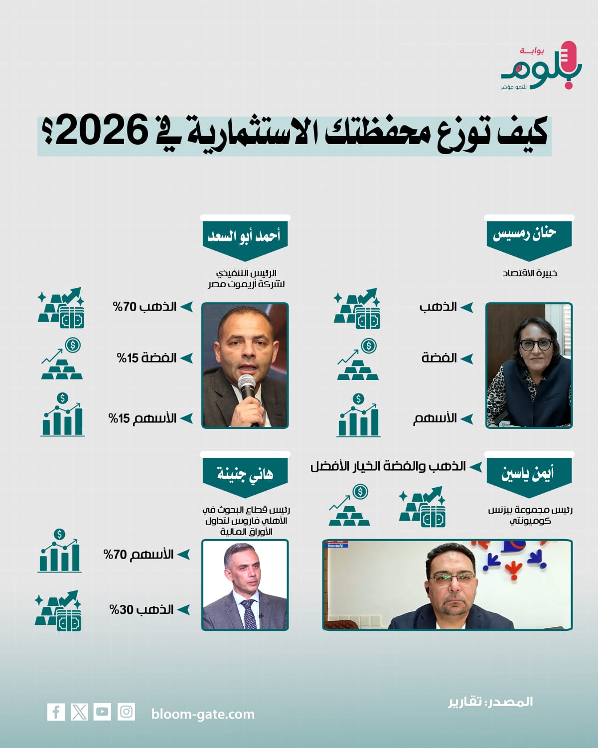يطرح مديرو الاستثمار استراتيجيات لبناء محفظة استثمارية متوازنة تشمل الأسهم التي ما زالت مرشحة للصعود والذهب وغيره من المعادن، فضلًا عن العقارات التي تظل خيارًا استثماريًا، ونلقي الضوء في هذا الإنفوجراف على ترشيح الخبراء للأوعية الاستثمارية في 2026.