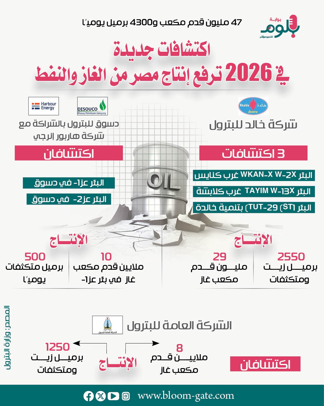 استهلت وزارة البترول 2026 بالإعلان عن اكتشافات وآبار جديدة للغاز الطبيعي ضمن خطة معدلات الإنتاج وتكثيف برامج الحفر والاستكشاف، بهدف تعويض التراجع في إنتاج الآبار لا سيما الغاز، ووضعت مصر هذه الآبار على خط الإنتاج لتلبية احتياجات السوق المحلية، وهي الاكتشافات التي نستعرض قدراتها والشركات المسؤولة عنها في الإنفوجراف القادم.