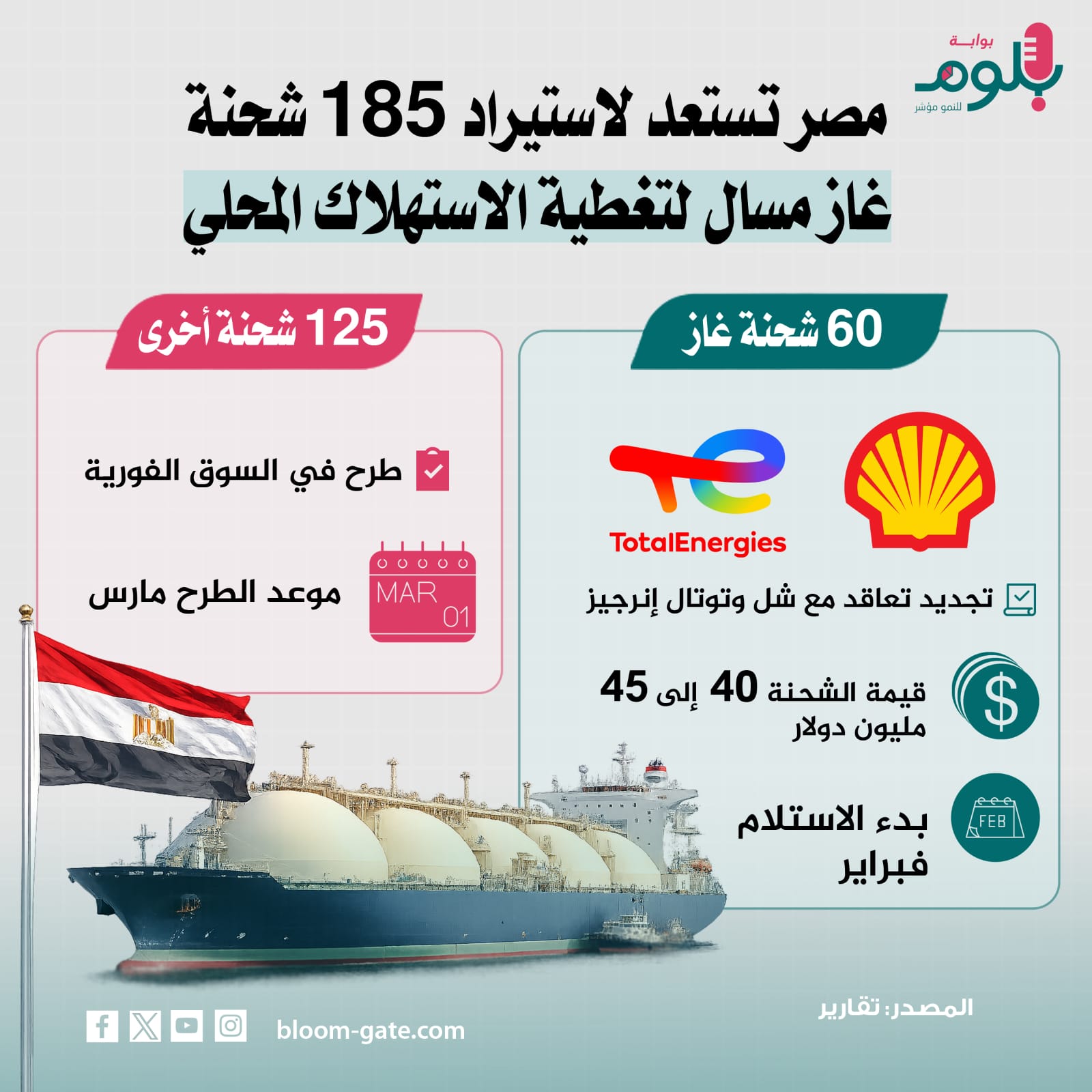 كما بدأت الحكومة في تغطية العجز بين إنتاج الغاز والاستهلاك للعام الجديد من خلال تجديد تعاقدات استيراد شحنات غاز مسال مع شركات عالمية، واعتزام التعاقد على أكثر من 100 شحنة، وهي الشحنات التي تغذي محطات الكهرباء وتحافظ على توريد الغاز للمصانع كثيفة الاستهلاك مثل الأسمدة، ونرصد في هذا الإنفوجراف التعاقدات الجديدة لشاحنات الغاز في 2026.