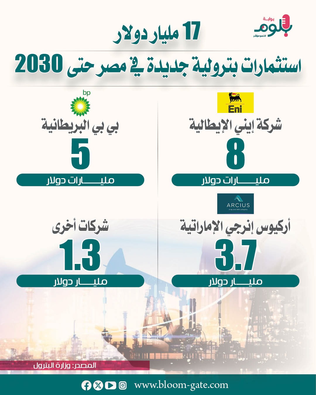 في الوقت نفسه، تعمل الحكومة جاهدة على جذب استثمارات أجنبية جديدة تسريع برامج الحفر، وطرحت نحو 70 فرصة استثمارية جديدة للبحث عن البترول والغاز في مناطق البحر المتوسط والبحر الأحمر والصحراء الغربية وخليج السويس والدلتا، مع تطبيق نظم استثمارية جاذبة في غرب المتوسط والبحر الأحمر لتشجيع الشركات العالمية على الاستثمار في هذه المناطق البِكر، وهناك حزمة استثمارات بمليارات الدولارات أعلنت الشركات الأجنبية عن اعتزام ضخها على الأجل المتوسط سوف نستعرضها في الإنفوجراف الآتي.