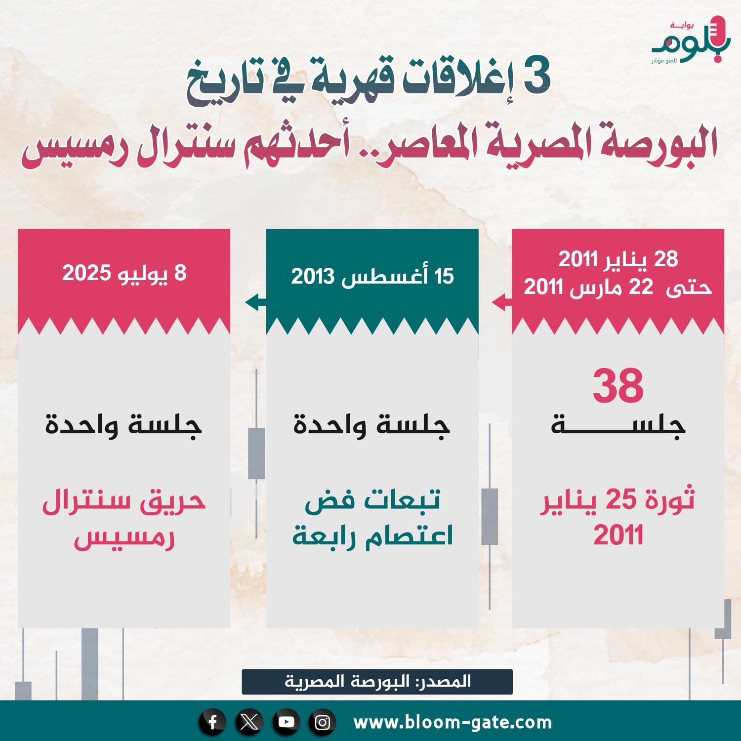 وتسبب تعطل أنظمة التداول نتيجة حريق سنترال رمسيس وتعطل الانترنت جزئياً في بعض المناطق في اتخاذ البورصة المصرية قراراً بتعليق التداول، أمس الثلاثاء، وهو القرار الذي اتخذته إدارة البورصة على حد وصفها بهدف توفير بيئة مناسبة للتداول، وتمكين شركات السمسرة أن تتواصل بالكفاءة المطلوبة مع كافة أطراف منظومة التداول وحرصاً على مصالح كافة الأطراف وعلى تكافؤ الفرص بين المتعاملين، ويأتي هذا الإغلاق بعد قرابة 12 عاماً من آخر إغلاق قهري شهدته البورصة المصرية، ونستعرض في هذا الإنفوجراف حالات إغلاق البورصة في العصر الحديث.