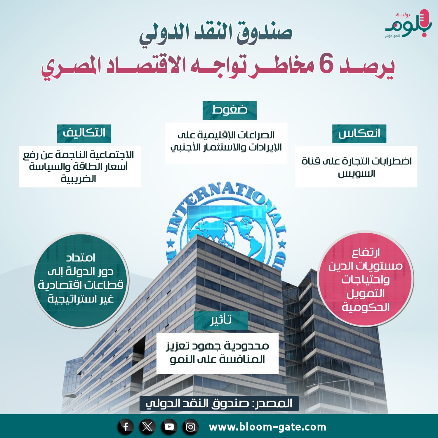 وعلى الرغم القومي تأكيد صندوق النقد أن مصر أحرزت تقدماً في العديد من الملفات المتعلقة بسياسة المالية العامة والسياسة النقدية، غير إنها أكد في تقرير اجتماع المجلس التنفيذي للصندوق مارس الماضي وجود حزمة مخاطر مائلة نحو التطورات السلبية، خاصةً فيما يتعلق باحتمالات تعرض مصر  لصدمات خارجية، إلى جانب التحديات المحلية على مستوى السياسات، وسنتعرف على أبرز هذه المخاطر في هذا الإنفوجراف.