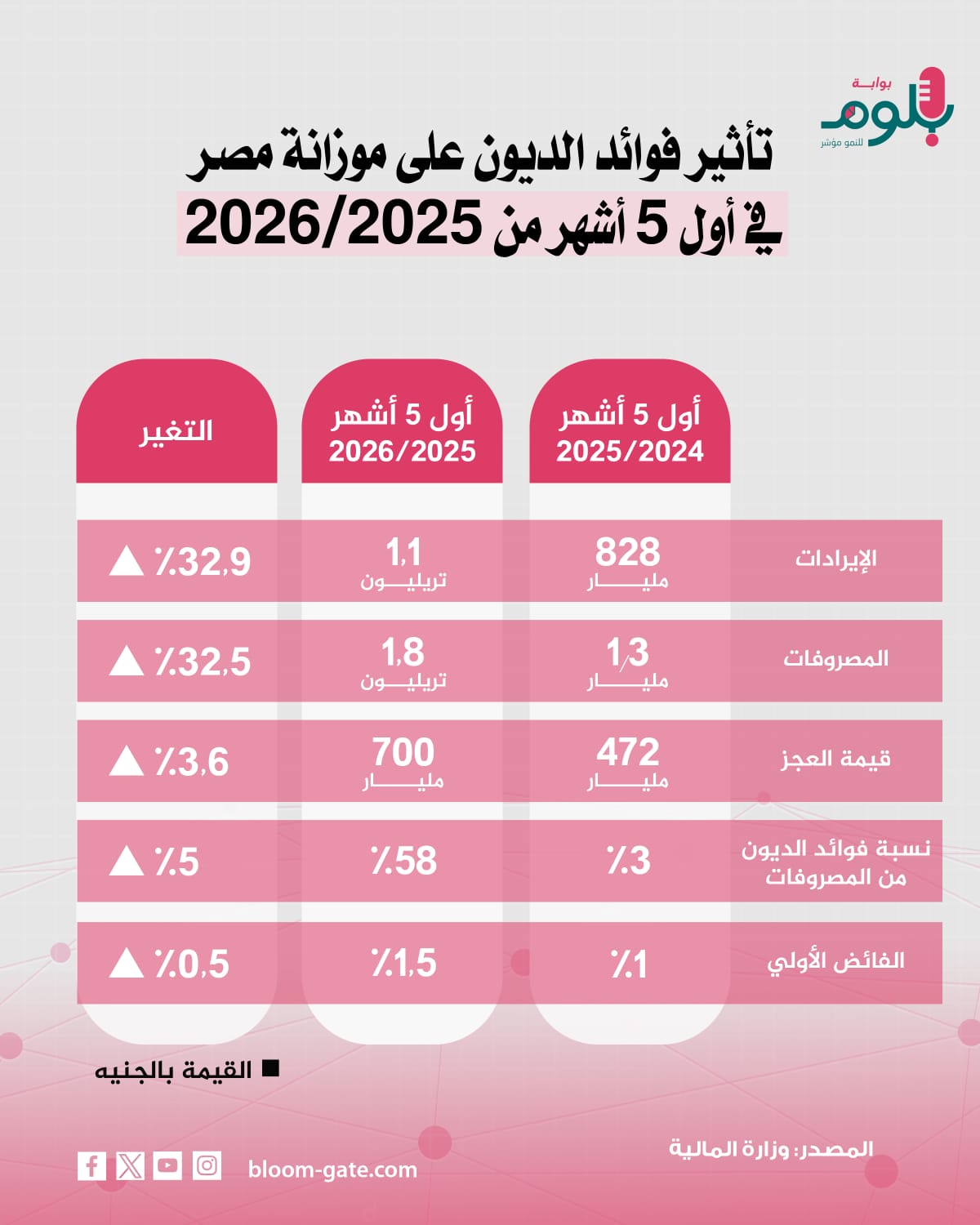 في الوقت نفسه، سيعاني اقتصاد مصر في 2026 من تفاقم مستمر لعجز الموازنة، بضغط من مدفوعات فوائد الدين التي تقترب من الاستحواذ بمفردها على 60% من مصروفات الموازنة، ما يضغط على بنود الإنفاق الأخرى بالموازنة من مكونات استثمارية وصحية وتعليمية وتنموية وغيرها، ونستعرض في الإنفوجراف القادم أحدث بيانات عجز الموازنة التي كشفت عنها وزارة المالية خلال أول 5 أشهر من العام المالي الجاري 2025/2026 والتي ترصد الخلل الواضح في عجز الموازنة.