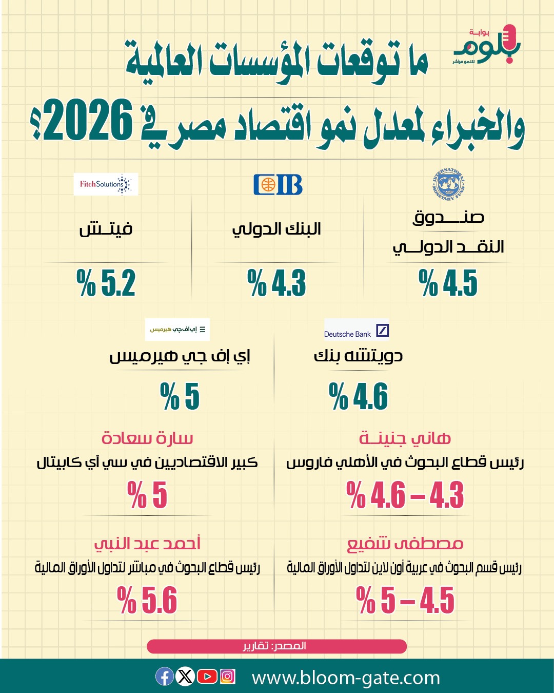توقّعت الدكتورة رانيا المشاط وزيرة التخطيط والتنمية الاقتصادية والتعاون الدولي أن يُحقق الاقتصاد المصري نموًا يتجاوز 5% العام المالي الجاري، في التطورات الإيجابية للأنشطة الاقتصادية، وعزم الحكومة المضي قدمًا في إجراءات الإصلاح الاقتصادي والهيكلي، والعمل على الوصول لمستويات 7% لزيادة معدلات التشغيل وتحقيق تنمية تنعكس على المواطن، ونرصد توقعات المؤسسات المالية العالمية وخبراء الاقتصاد لنمو اقتصاد مصر في  2026 خلال الإنفوجراف الآتي.