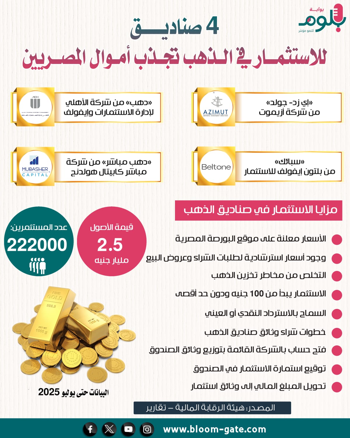 استقبل السوق المصري في عام 2023 أول صناديق الاستثمار في الذهب، وهو صندوق «إي زد- جولد» أصدرته شركة أزيموت، لتفتح الطريق أمام إطلاق أكثر من صندوق للذهب وسط إقبال من المستثمرين على شراء وثائق الصناديق، ويوضح الإنفوجراف التالي صناديق الذهب المتاحة في مصر وكيفية التداول من خلالها.