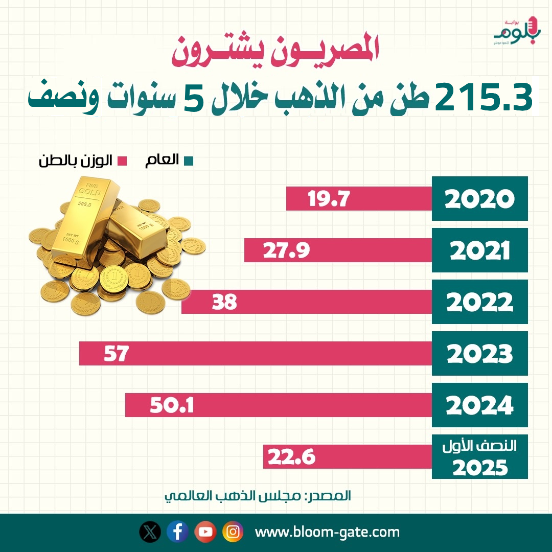 سجل حجم مشتريات المصريين من الذهب 11.5 طن في الربع الثاني من عام 2025، وهو انخفاض بنسبة 20% مقارنة بالربع الثاني من عام 2024 حين بلغ 14.4 طن، ومع ذلك، ارتفعت المشتريات بنسبة 3.6% مقارنة بالربع الأول من عام 2025، الذي سجل 11.1 طن، وللتعرف على مشتريات المصريين من الذهب خلال أكثر من 5 سنوات ماضية يمكن الاطلاع على هذا الإنفوجراف.