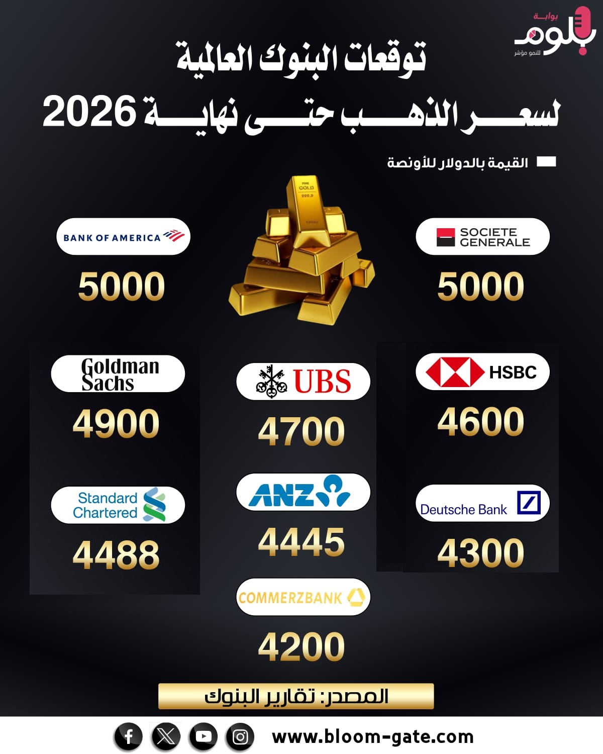 تتوقع المؤسسات المالية العالمية أن يحافظ المعدن النفيس على الزخم القوي خلال 2026، حيث تراوحت التوقعات لسعر الذهب بين 4200 إلى 5000 دولار للأونصة في نهاية عام 2026، ما يعكس ترجيحات بأن يظل الذهب هدفاً رئيسياً للمستثمرين خلال العام القادم للحفاظ على قيمة مدخراتهم، ويستعرض هذا الإنفوجراف توقعات البنوك العالمية لسعر المعدن الأصفر حتى نهاية العام المقبل.
