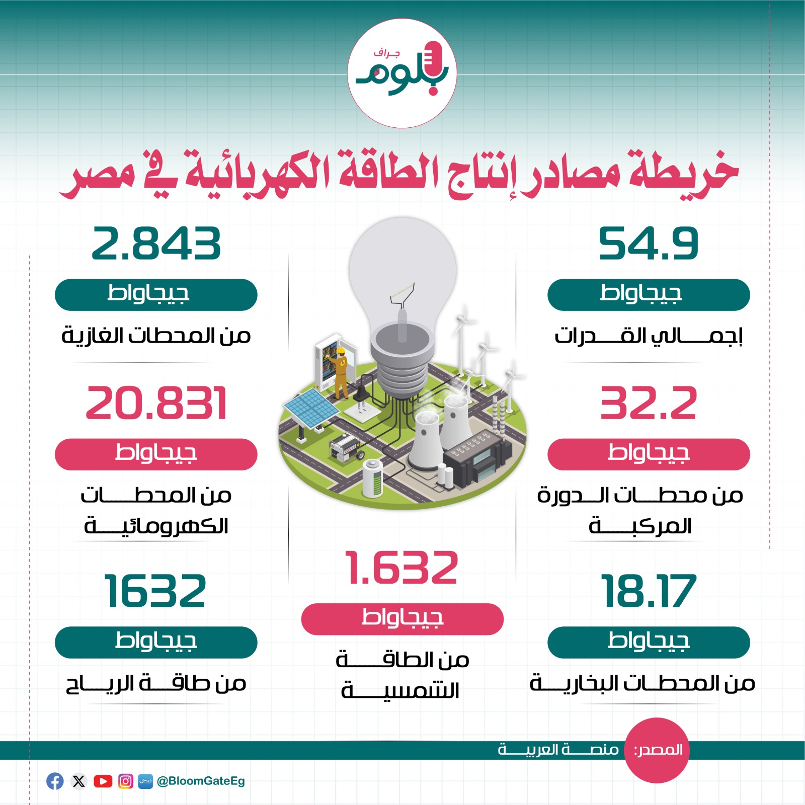 ما زالت تسيطر محطات الكهرباء التقليدية على مصادر إنتاج الطاقة الكهربائية في مصر وعلى رأسها محطات الطاقة المركبة التي تعتمد على دمج محطة غازية مع أخرى بخارية للتشغيل، وذلك على الرغم من إعلان البلاد منذ أكثر من 10 سنوات عن خطط تعزيز إنتاج الطاقة المتجددة كمصدر مستدام ونظيف، ويوضح الإنفوجراف التالي مصادر مصر لتوليد احتياجاتها من الكهرباء.