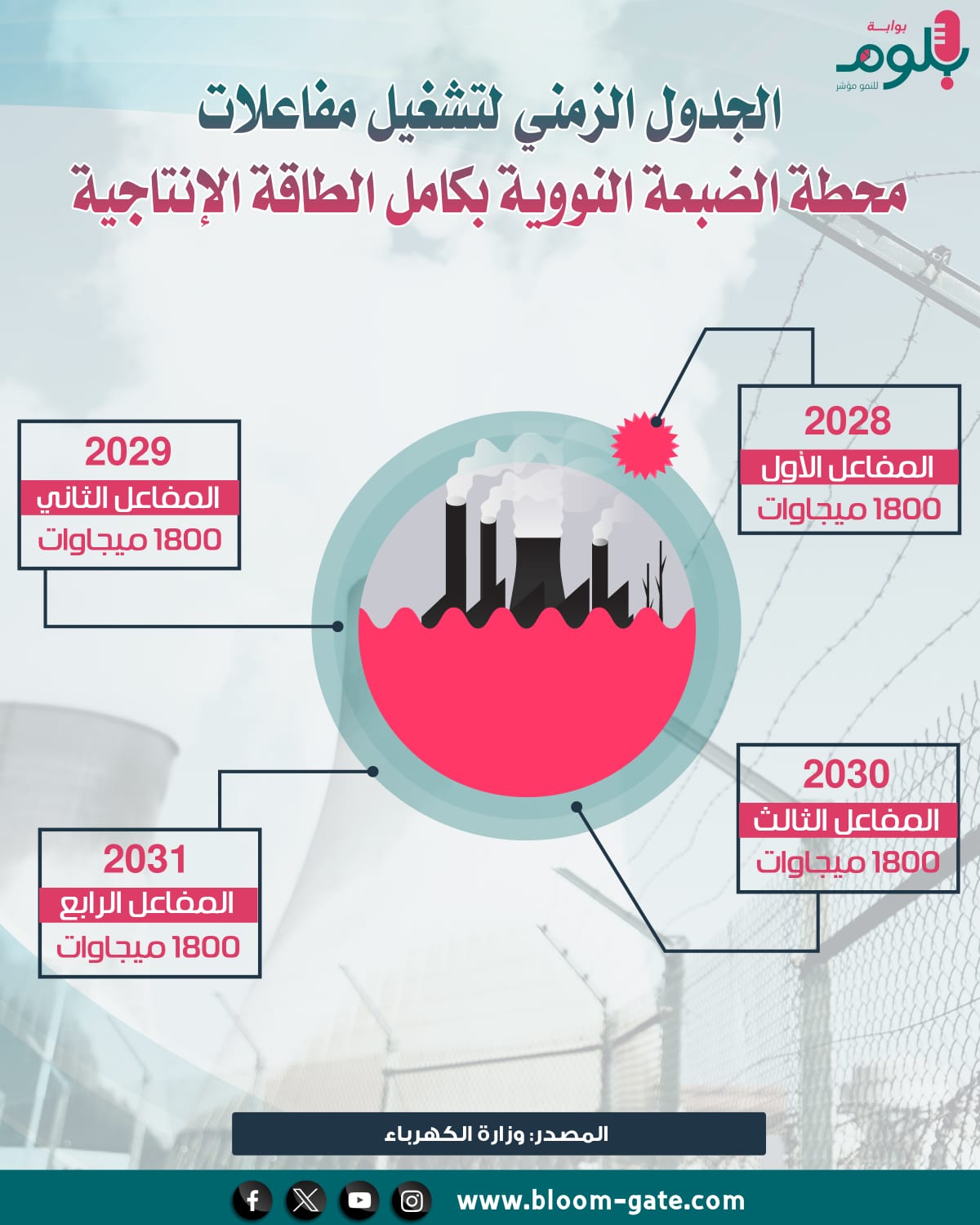قطعت مصر 8 سنوات حتى الآن في أعمال بناء وتوريد معدات وإنشاءات محطة الضبعة، منذ انطلاق الأعمال في الربع الأخير من عام 2017، ومن المقرر أن تعمل المفاعلات الأربعة بالمحطة تباعاً حتى يكون قد وصل لكامل طاقته الإنتاجية بحلول عام 2031، ونستعرض في هذا الإنفوجراف المخطط الزمني لتشغيل المحطة.