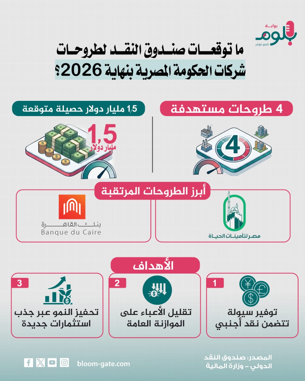 في الوقت نفسه كشف صندوق النقد الدولي في أحدث تقاريره عن برنامج مصر الاقتصادي عن ملامح جديدة لبرنامج الطروحات الحكومية في مصر، مؤكدا أن الحكومة حددت 4 صفقات رئيسية تعتزم تنفيذها قبل نهاية البرنامج التمويلي الحالي في ديسمبر 2026، وسنتعرف في الإنفوجراف القادم على توقعات صندوق النقد.