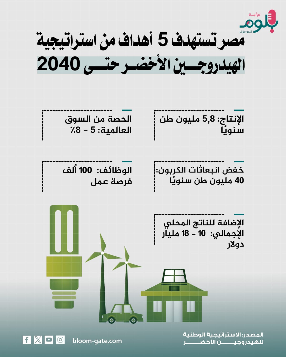في الوقت نفسه، أطلقت الحكومة المصرية استراتيجية طموحة لإنتاج الهيدروجين الأخضر بحلول 2040، ثم حدثتها وأقرتها وحولتها إلى المجلس الأعلى للطاقة، الذي قام بدوره الذي بإصدار الاستراتيجية الوطنية للهيدروجين الأخضر، والتي سنسلط الضوء على أبرز أهدافها في الإنفوجراف الآتي.