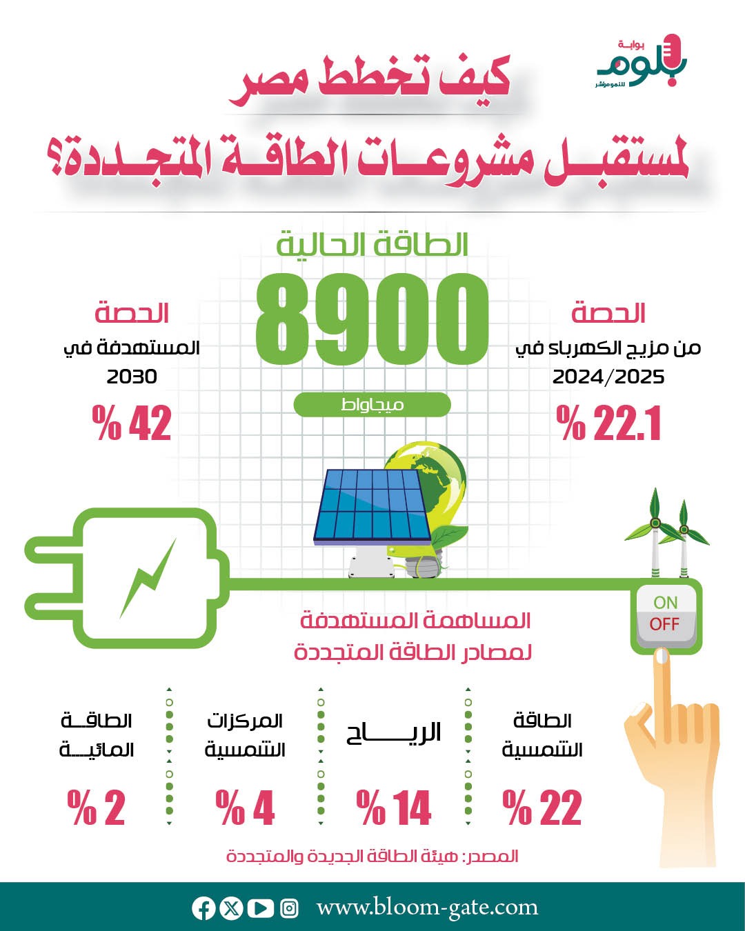 وبشكل عام تعمل مصر على التوسع في مشروعات الطاقة المتجددة، إذ وقعت الحكومة مؤخرًا اتفاقيات مع شركة سكاتك النرويجية لتنفيذ مشروعين متكاملين للطاقة المتجددة باستثمارات تتجاوز 1.8 مليار دولار، وهما محطة للطاقة الشمسية وأنظمة تخزين الطاقة، واتفاقية شراء طاقة طويلة الأجل مع الشركة المصرية لنقل الكهرباء لتوليد نحو 1.95 جيجاوات من الطاقة الشمسية و3.9 جيجاوات ساعة من تخزين البطاريات، وتأتي الاتفاقيتين ضمن مخطط مصر للاعتماد على الطاقة النظيفة لتقليل فاتورة استيراد الغاز الطبيعي لتشغيل محطات الكهرباء التقليدية، ونستعرض في الإنفوجراف الآتي مستهدفات الطاقة المتجددة في مصر.
