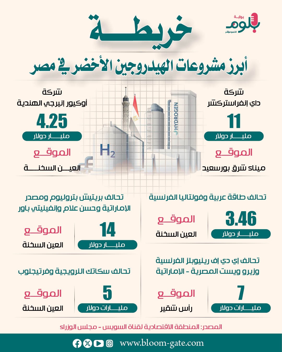 وقعت مصر على مدار السنوات الخمس الماضية عددًا من الصفقات الضخمة مع شركات استثمارية كبري في مجال إنتاج الهيدروجين الأخضر والأمونيا الخضراء، وارتبط أغلب هذه المشروعات بكيانات أوروبية انطلاقًا من دعمها للمشروعات الصديقة للبيئة، ونستعرض في الإنفوجراف التالي أبرز عقود مشروعات الهيدروجين الأخضر في مصر.