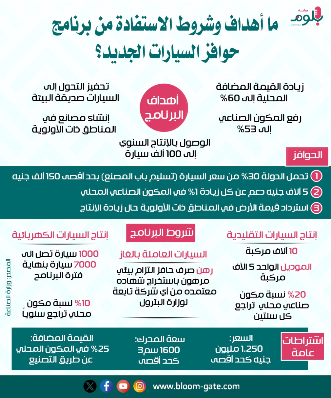 فيما أطلقت الحكومة في مايو الماضي برنامجاً جديداً لحوافز السيارات يشكل صُلب استراتيجية توطين صناعة السيارات، بهدف تشجيع الشركات على قطع خطوات أسرع في ضخ استثمارات في بناء خطوط جديدة، تحقيق التعميق المطلوب لصناعة السيارات، والحد من الواردات وتحفيز الصادرات وتعظيم الاستفادة من الاتفاقيات الدولية، ويلقي هذا الإنفوجراف الضوء على أهداف البرنامج والحوافز الجديدة وشروط الاستفادة منها.