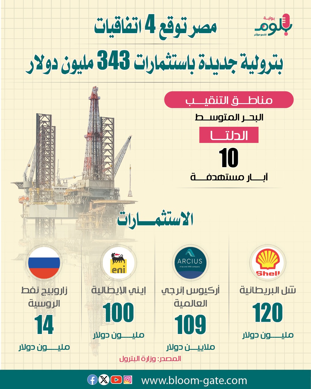 في الوقت نفسه، تسعى الحكومة إلى زيادة الانتاج وتحقيق استكشافات جديدة من حقول البترول والغاز في المناطق الواعدة مثل البحر المتوسط والدلتا، وكان أحدث هذه الخطوات توقيع الشركة المصرية القابضة للغازات الطبيعية “إيجاس” الأسبوع الحالي أربع اتفاقيات جديدة مع عدد من كبرى الشركات العالمية للبحث عن الغاز والبترول، وهي الاتفاقيات التي نسلط عليها الضوء في الإنفوجراف الآتي من حيث الشركات والأعمال المستهدفة وحجم الاستثمارات.
