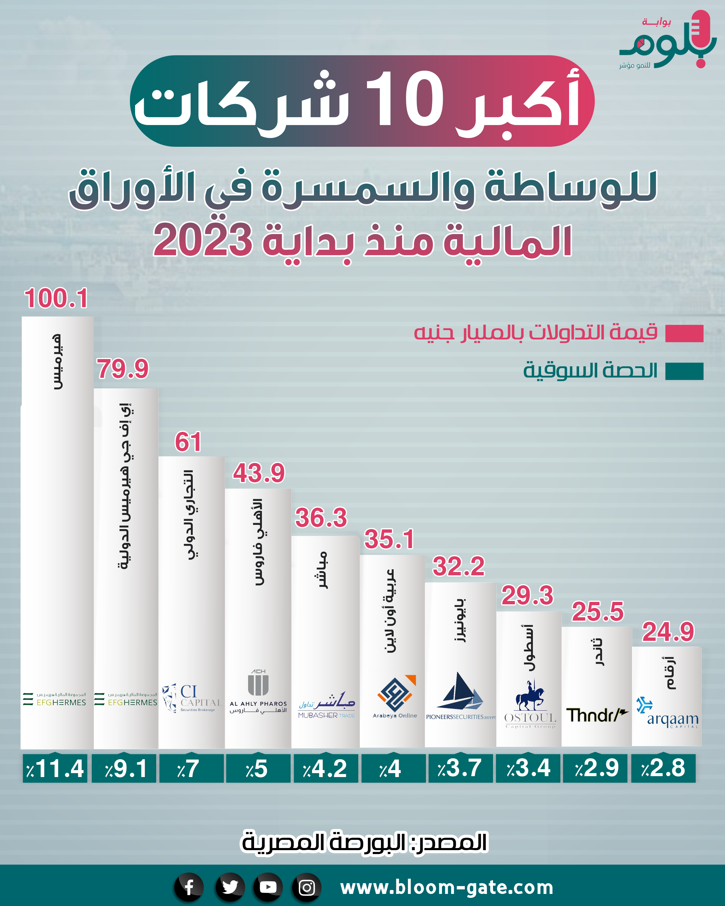 وبحسب بيانات التقرير، فإن الشركات العشر الأكبر خلال الأشهر التسعة الأولى من العام الجاري، سجلت قيمة تداولات بلغت 468.2 مليار جنيه، فيما بلغت قيمة التداولات التي سجلتها تلك الشركات نحو 86.1 مليار جنيه خلال شهر سبتمبر فقط، وفي الإنفوجراف الآتي سوف نسلط الضوء على أداء تلك الشركات العشرة، وحصصها السوقية خلال الفترة من يناير لسبتمبر.