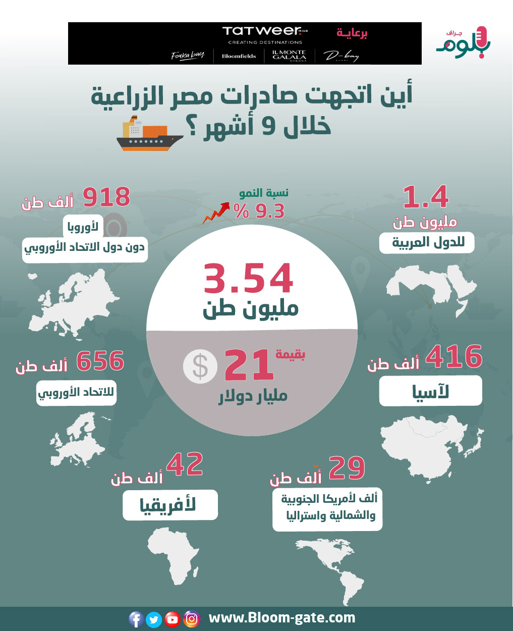 وفي إصدار اليوم من «بلوم جراف» سوف نسلط الضوء عل قطاع الحاصلات الزراعية وآخر التطورات التي شهدها، سواء على الصعيد المحلي من خلال التوسع في زراعة المحاصيل، وخطوات الدولة وشركات القطاع الخاص في هذا الصدد، وأيضا على مستوى التصدير، وكيف يمكن للقطاع أن يتزيد من حصته خلال الفترة المقبلة، وسنبدأ في الانفوجراف الآتي بعرض أهم الأرقام التي توضح خريطة صادرات الحاصلات الزراعية المصرية خلال الفترة الماضية.
