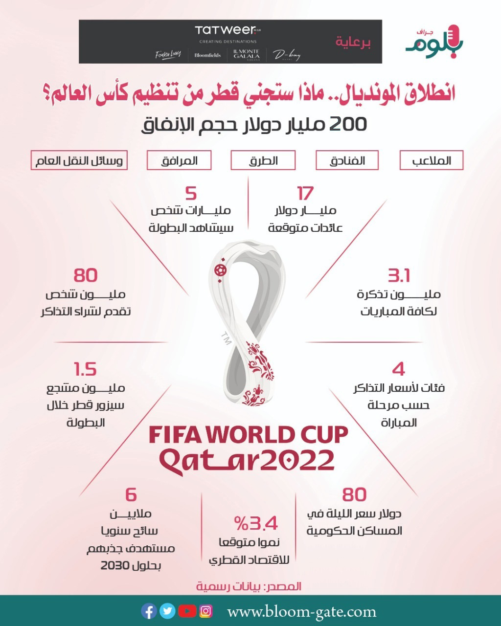 وأنفقت قطر مئات مليارات الدولارات للاستعداد للبطولة من جانب وإقامة مشروعاتها التنموية الأخرى التي تعمل عليها أيضا، ووصل معدل الإنفاق الأسبوعي خلال السنوات السبع الأخيرة، إلى نحو 500 مليون دولار أسبوعياً، بحسب ما كشفه وزير المالية القطري السابق، لتصل التكلفة الإجمالية للمشروعات الضخمة إلى نحو 200 مليار دولار، نصيب مشاريع المونديال منها 8 مليارات دولار، وفي الإنفوجراف الآتي سوف نسلط الضوء على بعض الأرقام الاقتصادية من مونديال كأس العالم في قطر.