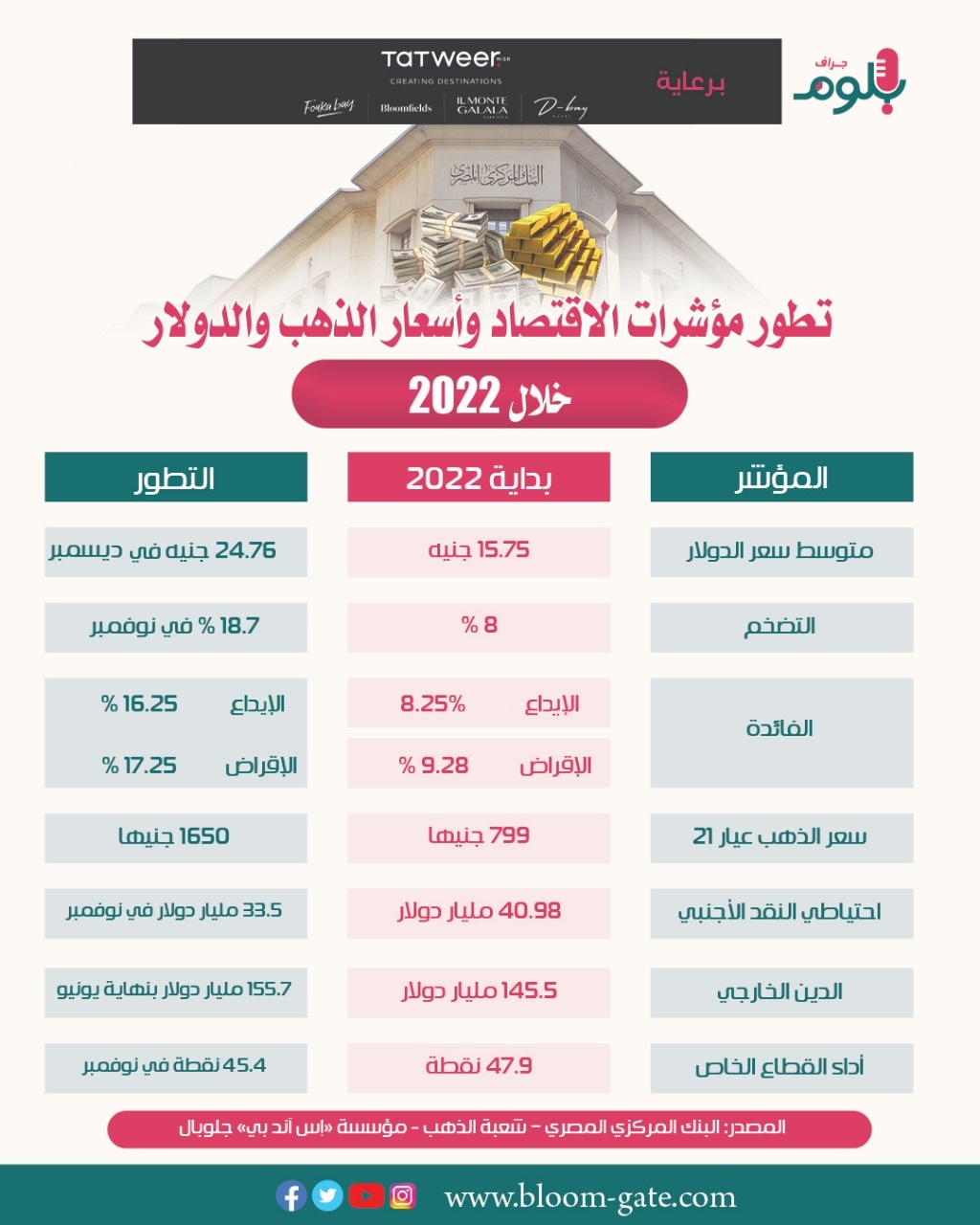 شهد العام 2022 العديد من التطورات الاقتصادية، نتيجة للتغيرات التي طرات على الساحة العالمية، وتبعاتها على السوق المصري، وهو ما دفع الحكومة والبنك المركزي، لاتخاذ قرارات وإجراءات من شأنها تقليل حجم التأثير، ومحاولة الحفاظ على المعدلات التي تحققت على مدار السنوات الماضية، وفي الإنفوجراف الآتي، سوف نسلط الضوء على التطورات التي طرأت على عدة مؤشرات اقتصادية، مع الإشارة إلى ما حدث لسعر الدولار أمام الجنية، وأيضا أسعار الذهب.