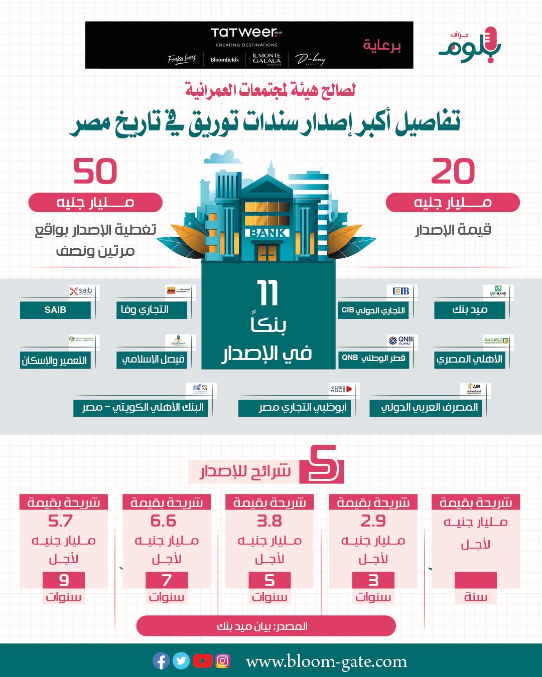 أعلن ميد بنك، أمس عن مشاركته في طرح سندات توريق بقيمة 20 مليار جنيه، لصالح هيئة المجتمعات العمرانية، والذي يعد الأكبر في تاريخ السوق المالية، وبلغت حصة ميد بنك منه 100 مليون جنيه، وفي الإنفوجراف الآتي سوف نستعرض تفاصيل الإصدار، وشرائحه، والبنوك المشاركة به.