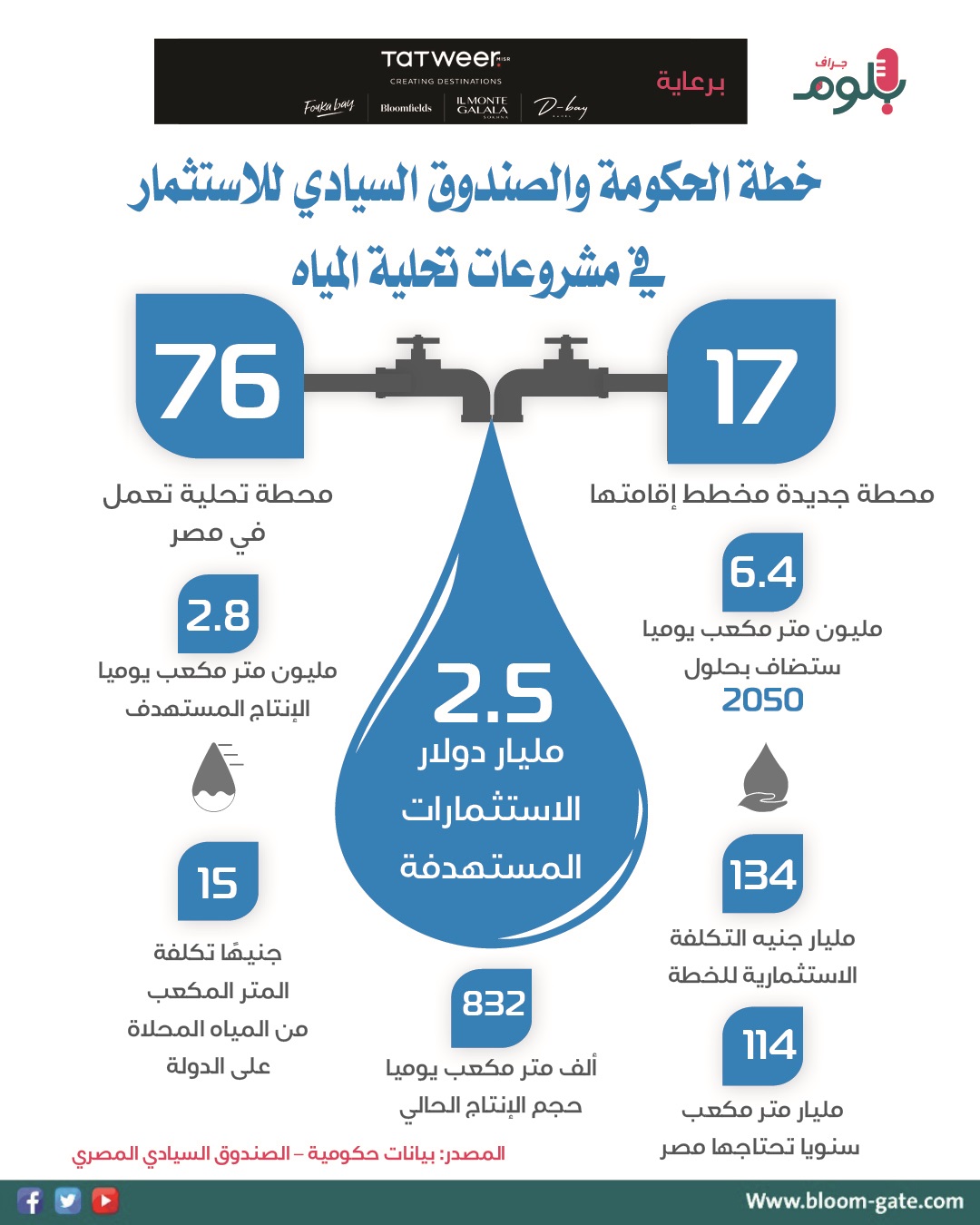 وفي إصدار اليوم من «بلوم جراف» سوف نسلط الضوء على ملف المياه، نظرا للأهمية الكبيرة التي يتمتع بها، ومع التحركات المستمرة التي تقوم بها الحكومة للتوسع نحو إقامة المزيد من محطات تحلية مياه البحر، والاستفادة من الخبرات المتقدمة في هذا المجال، بهدف إتاحة المياه النقية، خاصة في المناطق الساحلية والمحافظات المطلة على البحرين الأحمر والمتوسط وخليجي السويس والعقبة، وفي الإنفوجراف الآتي سوف نستعرض بعض الأرقام الخاصة بخطة الحكومة والصندوق السيادي والمتعلقة بالاستثمار في تحلية المياه.