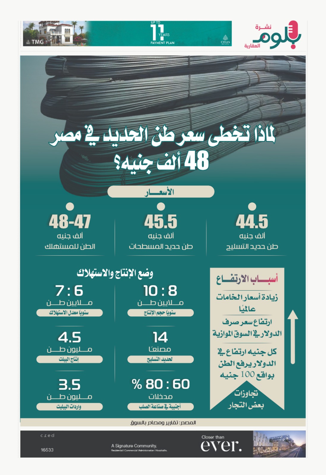 قفز سعر طن الحديد في مصر بصورة كبيرة خلال الآونة الأخيرة، في ظل الارتفاع المستمر في تكلفة الإنتاج، وفق ما وصفه مستثمرون في القطاع، وهو ما أثر بالتبعية على سعر البيع للمستهلكين، وظهرت تأثيراته بصورة واضحة على القطاع العقاري، باعتبار أن سعر طن الحديد هو أحد المدخلات الرئيسية في تلك الصناعة العملاقة، ولجأت شركات التطوير العقاري إلى تخزين كميات من الحديد وباقي مواد البناء التي يمكن تخزينها لمواجهة التغيرات المستمرة في أسعارها، وفي الإنفوجراف الآتي سوف نسلط الضوء على الأسباب التي أدت إلى صعود أسعار الحديد، وفق ما رصدته عدة تقارير ومتعاملون في السوق.