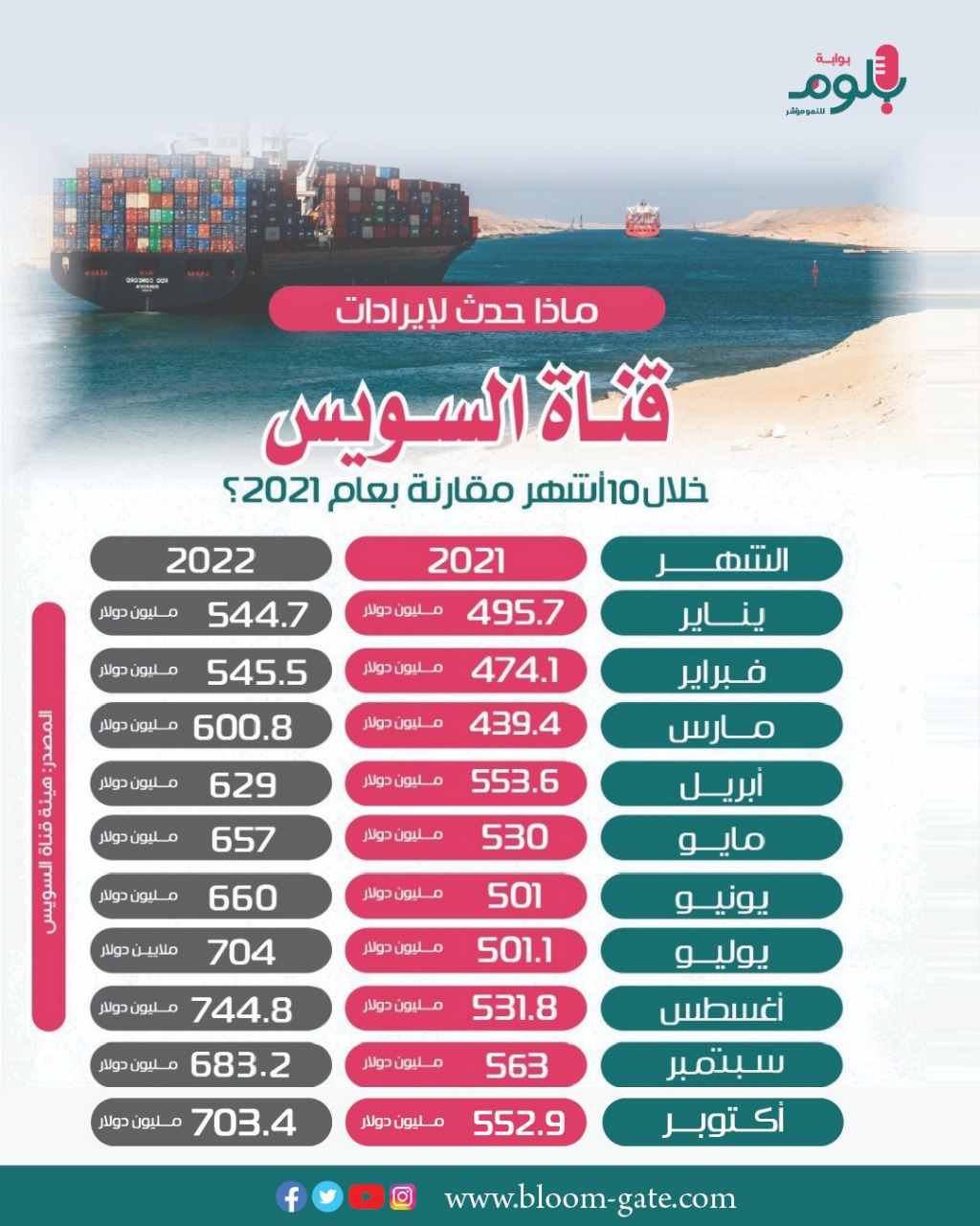 تعتمد الحكومة المصرية على إيرادات هيئة قناة السويس في توفير العملة الصعبة، باعتبارها أحد مصادر لدخل الخمسة للدولار في مصر، وذلك في ظل أوضاع اقتصادية عالمية محاطة بالتحديات، والتي ألقت بظلالها على معدلات التجارة العالمية، وفي الإنفوجراف الآتي سوف نستعرض آخر الأرقام المعلنة بشأن إيرادات قناة السويس، خلال الفترة من يناير وحتى شهر أكتوبر الجاري، مقارنة بنفس الفترة من العام الماضي.