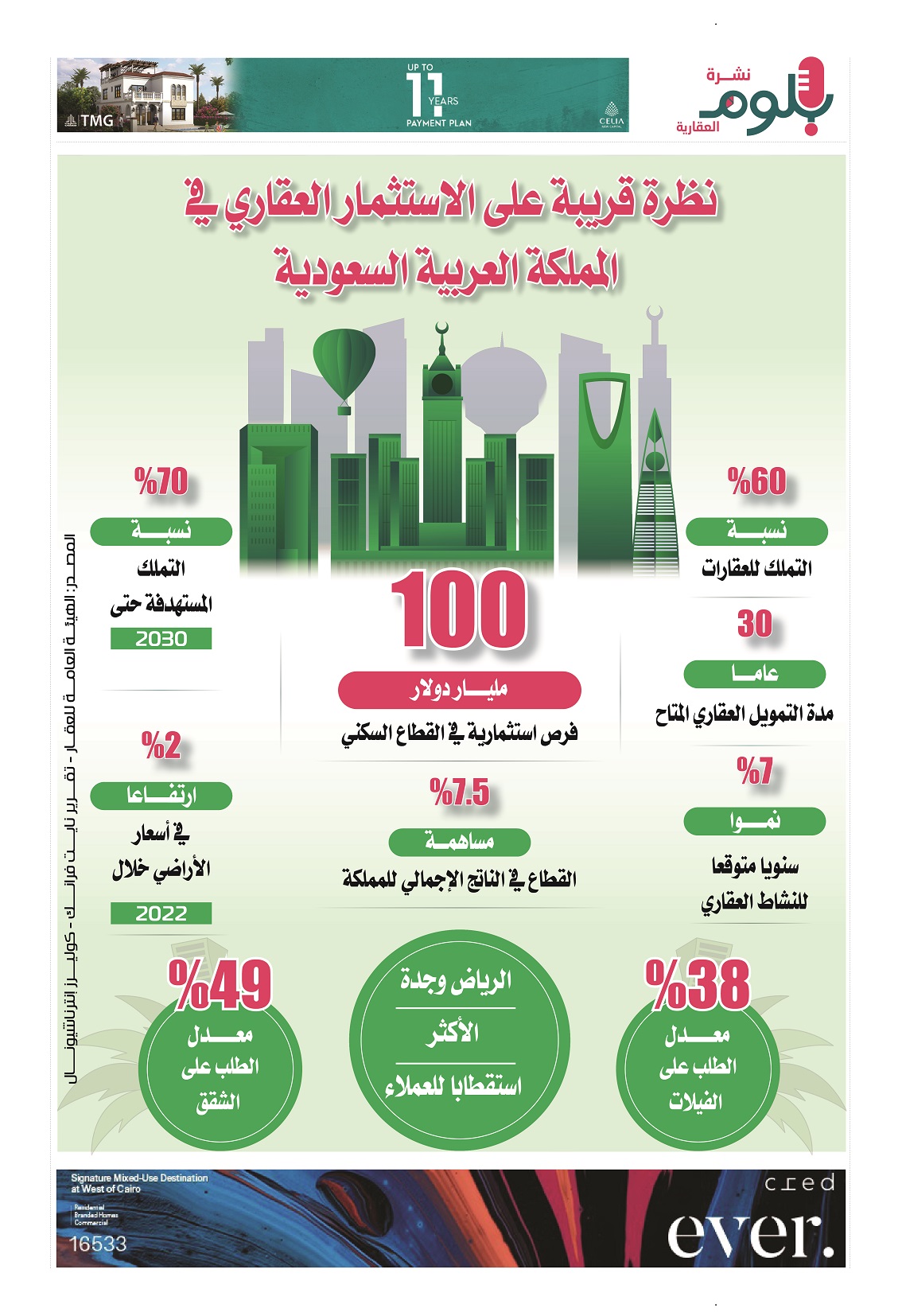 استحوذت المملكة العربية السعودية، خلال الفترة الماضية على الاهتمام الأكبر من شركات التطوير العقاري الراغبة في الاستثمار خارج مصر، وهو ما ظهر واضحا من خلال التحركات التي قامت بها عدة شركات، من خلال المباحثات التي تم عقدها، او الشراكات التي تم إبرامها، بين شركات مصرية وسعودية، وهو ما دفعنا فيب الإنفوجراف الآتي لتسليط الضوء على الاستثمار العقاري في المملكة، والمؤشرات المحققة به والمستهدفات، سعيا منا لإيضاح الصورة حول ذلك السوق العملاق.
