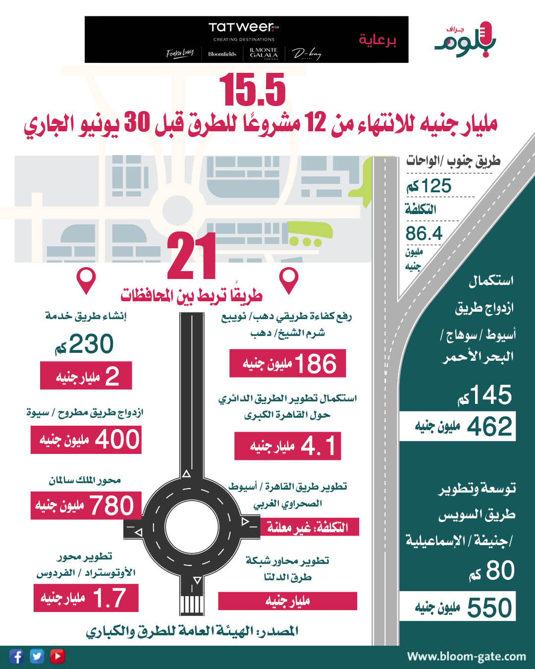 ومن هذا المنطلق، فإننا في إصدار اليوم من «بلوم جراف» سوف نسلط الضوء على محور الطرق، وسنبدأ في الإنفوجراف الآتي، بالمشروعات التي يتم تنفيذها حاليا بمختلف أرجاء الجمهورية، والخاصة بالعام المالي الجاري، والتي من المقرر أن يتم الانتهاء منها قبل 30 يونيو الجاري.