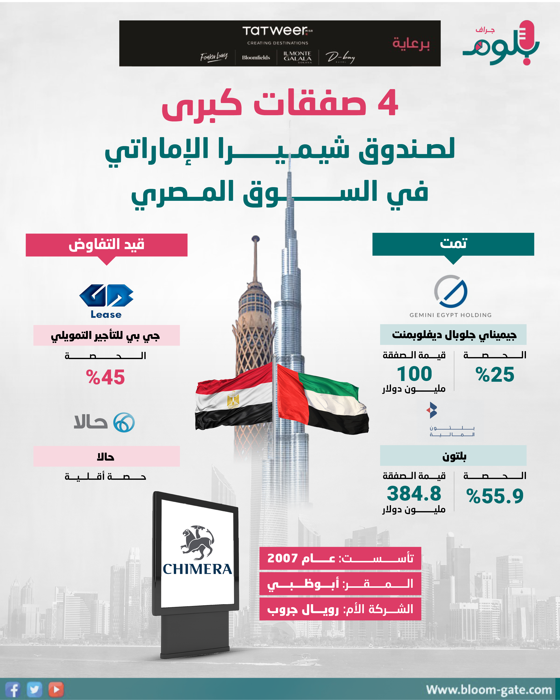 وساهم صندوق شيميرا، بدور كبير في المنافسة على العديد من الصفقات في مصر، ما نتج عنه إبرام صفقتين، إحداهما بنهاية العام الماضي، والأخرى في شهر أغسطس، وفي الإنفوجراف الآتي سوف نسلط الضوء على الصفقات التي دخلت شركة شيميرا كطرف فيها.