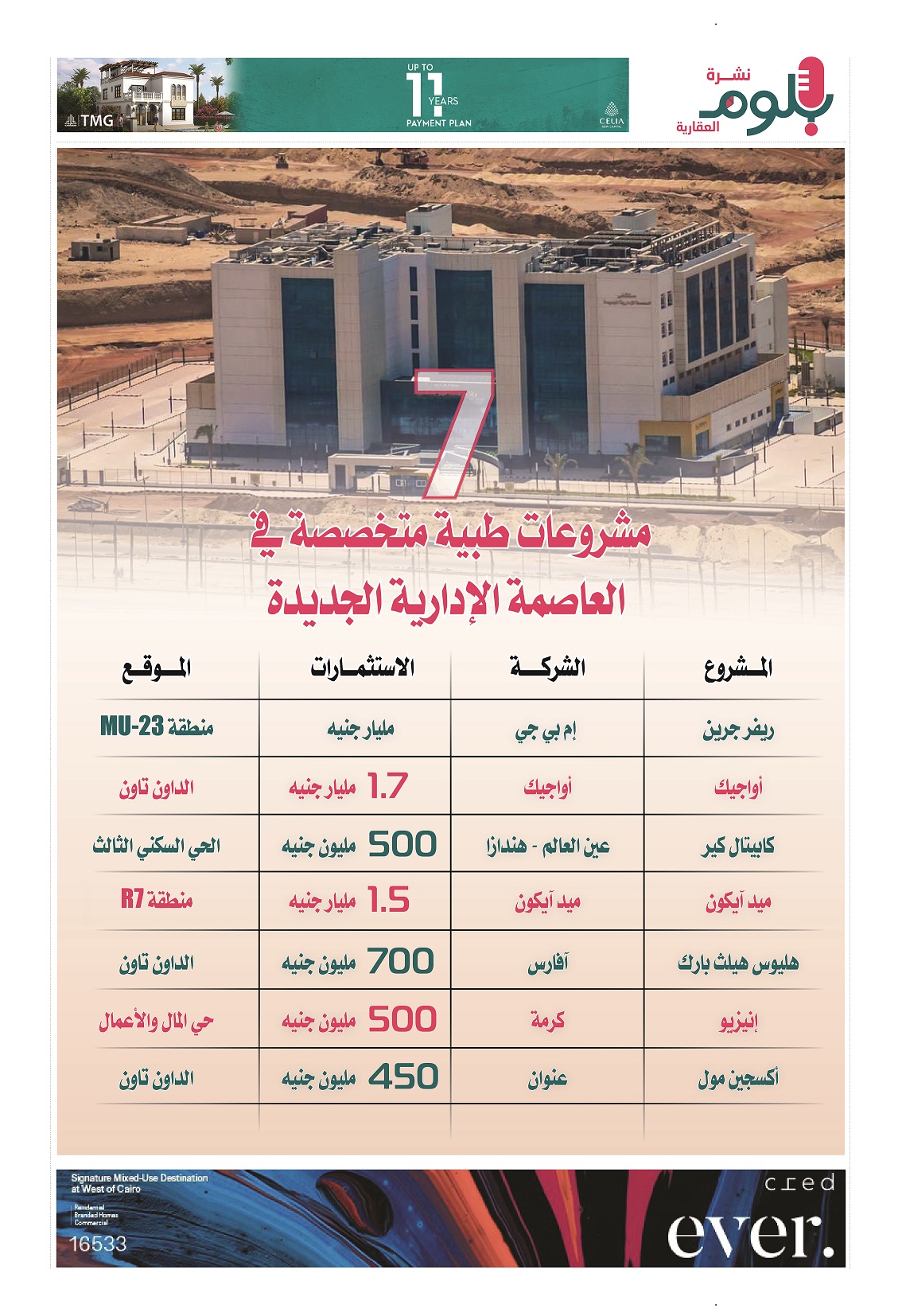 ركزت الشركات العقارية خلال الآونة الأخيرة، على إطلاق مشروعات نوعية، وذلك ضمن استراتيجيتها لتنويع محفظتها الاستثمارية من جانب، وتحقيق التكامل العمراني من جانب آخر، وفي إنفوجراف اليوم سوف نسلط الضوء على المشروعات الطبية التي تم إطلاقها في العاصمة الإدارية الجديدة باعتبارها المشروع العمراني الاكبر في مصر.