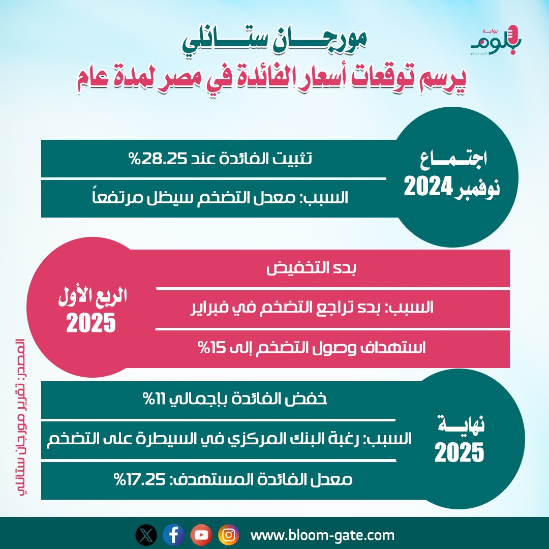 أصدر بنك مورجان ستانلي هذا الأسبوع مذكرة بحثية تتوقع مسار أسعار الفائدة في مصر لمدة عام، استناداً إلى توقعات تطور معدلات التضخم، والتي ترتبط بشكل أساسي بأداء الاقتصاد المحلي وتطور الأوضاع الجيوسياسية والاقتصاد العالمي، إذ يتوقع البنك الأميركي أن يظل معدل التضخم مرتفعا في الأمد القريب، بسبب تأثيرات زيادات أسعار الطاقة، وتراجع سعر صرف الجنيه أمام الدولار منذ نهاية أكتوبر، قبل أن يتخذ التضخم مساراً نزولياً اعتباراً من العام المقبل، ويلقي الأنفوجراف التالي الضوء على توقعات مورجان ستانلي لأسعار الفائدة في السوق المصري.