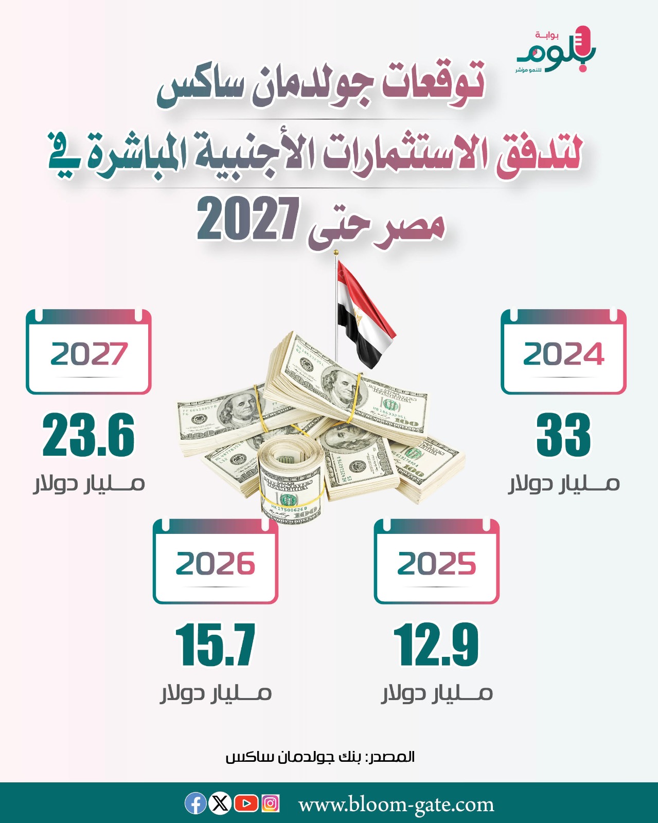 ومؤخرا كشف تقرير حديث من بنك جولدمان ساكس أن الاستثمار الأجنبي المباشر إلى مصر سيرتفع بوتيرة أسرع من التوقعات، ليصل خلال 2024 وحده إلى 33 مليار دولار، مشيرا إلى تحقيق تطور هائل في مصر بعد أن استثمرت الإمارات العربية المتحدة في مشروع رأس الحكمة على الساحل الشمالي لمصر، والذي أعقبه بعد فترة وجيزة تعويم الجنيه المصري، وارتفاع أسعار الفائدة، وتوقيع اتفاقية مع صندوق النقد الدولي للحصول على تسهيلات تمويلية ممتدة، وفي الإنفوجراف الآتي سوف نسلط الضوء على التدفقات الاستثمارية المتوقعة حتى العام 2027.