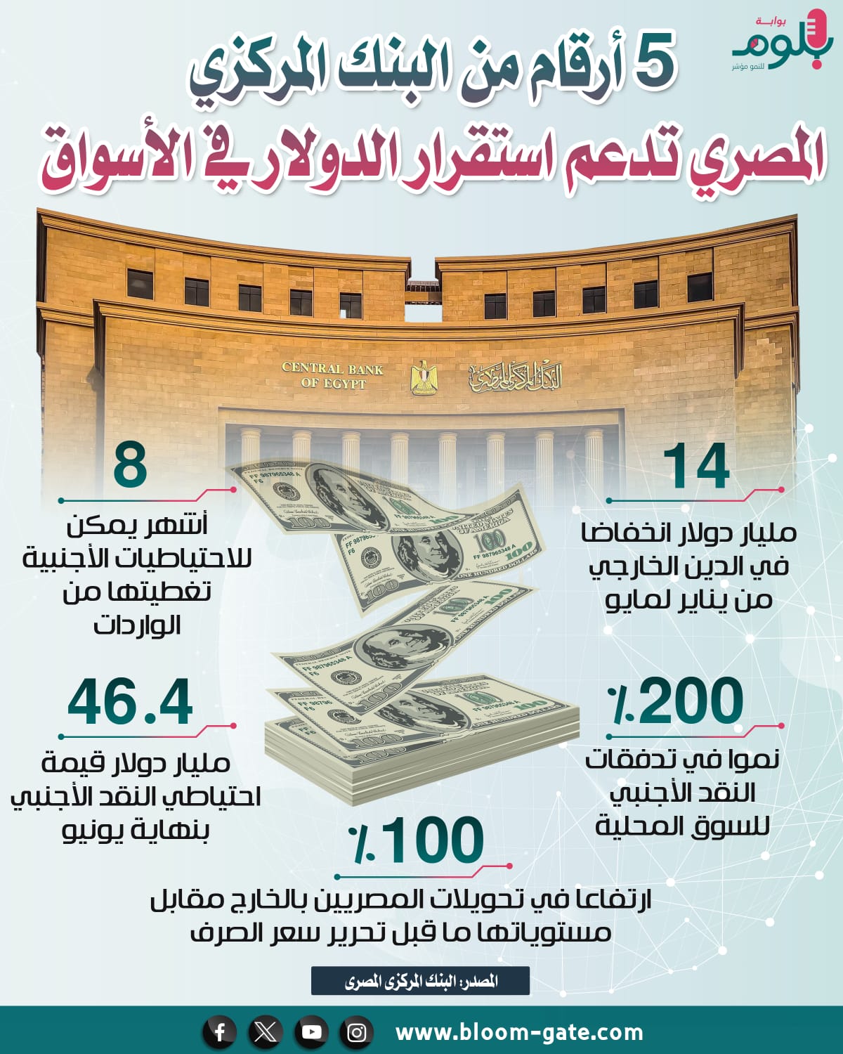 وفاجأ البنك المركزي المصري الأسواق بالكشف عن بيانات إيجابية تخص ملفات الديون والتدفقات النقدية، مع زيادة حجم التحويلات من المصريين في الخارج، إلى جانب الزيادة التي طرأت في احتياطي النقد الأجنبي، وما هي المدة التي يغطي فيها ذلك الاحتياطي واردات مصر، مشيرا إلى أن الصعود القوى لتدفقات العملة ساهم فى القضاء على عجز الأصول الأجنبية للبنك المركزى لتسجيل فائضًا قدره 10.3 مليار دولار في يونيو 2024، مع الحفاظ على استقرار الدولار في مصر وفي الإنفوجراف الآتي سوف نسلط الضوء على أهم 5 أرقام أعلنها البنك المركزي.