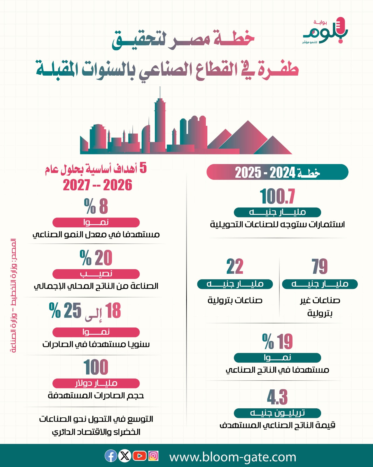 وفي يونيو الماضي، كشفت وزارة التخطيط والتنمية الاقتصادية مستهدفات واستثمارات قطاع الصناعات التحويلية بخطة العام المالي 2023/2024، والتي تستهدف منها على تنويع البنيان الإنتاجي للدولة وزيادة مرونته وتعزيز التنافسية الدولية للاقتصاد المصري، وبالتوازي مع ذلك أعلنت وزارة الصناعة هي الأخرى عن استراتيجية جديدة لإحداث طفرة في القطاع الصناعي في مصر حتى عام 2027، وفي الإنفوجراف الآتي سوف نسلط الضوء على أهم ما جاء في تلك الخطة.