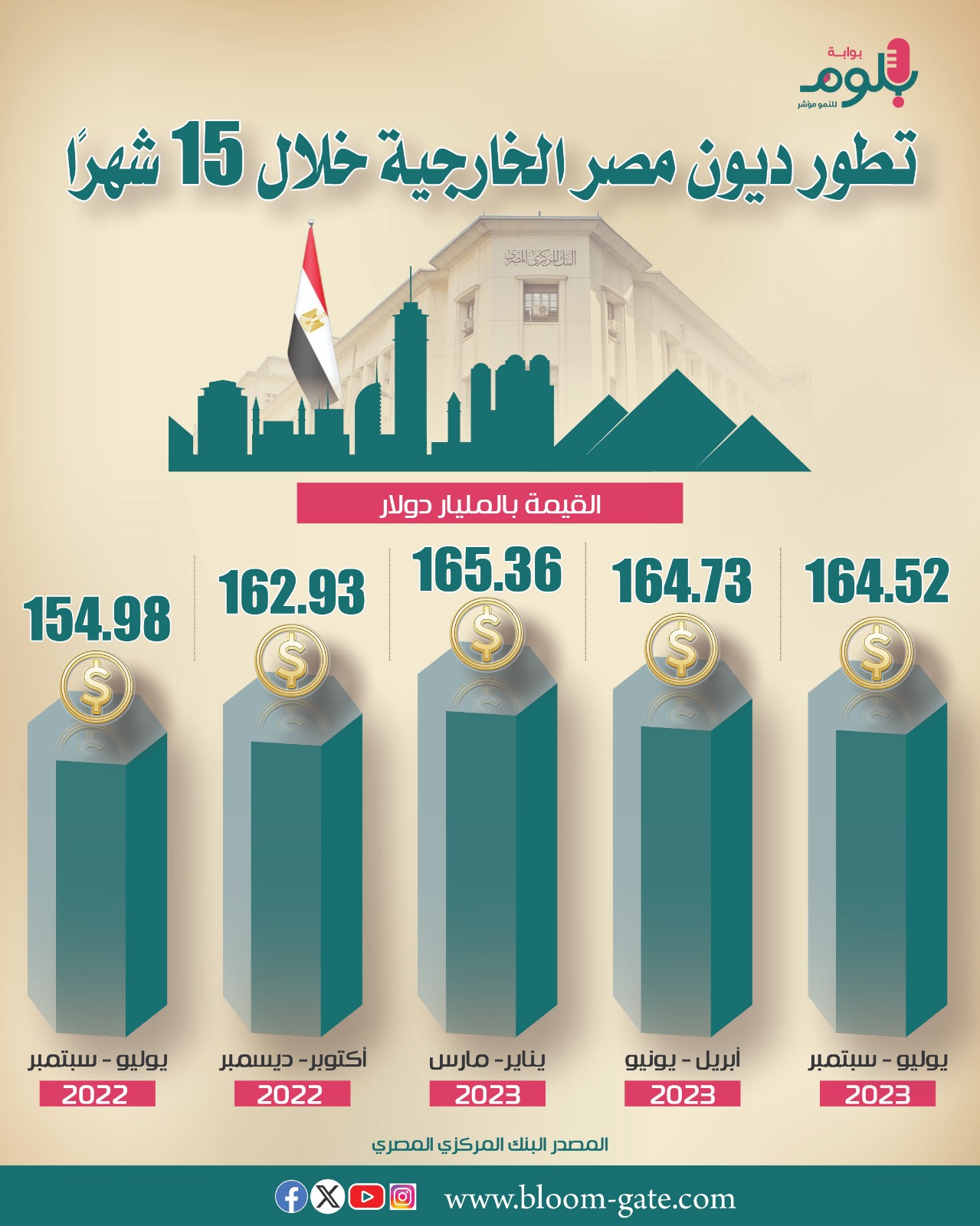 وتواجه مصر فجوة تمويلية منذ منتصف العام 2022، مع اندلاع الأزمات الجيوسياسية في المنطقة ومشكلات سلاسل التوريد، ومن ثم القفزات الكبيرة في معدلات التضخم، وهو ما أدى إلى توجه الحكومة نحو التمويلات، ومع زيادة الفيدرالي الأميركي لأسعار الفائدة فإن أعباء الديون زادت، ولكن خلال الربعين الأخير من العام المالي الماضي والأول من العام المالي الجاري شهدا تراجعا في المعدلات، وفي الإنفوجراف الآتي سوف نستعرض تطور ديون مصر الخارجية منذ يونيو 2022، وحتى سبتمبر 2023.