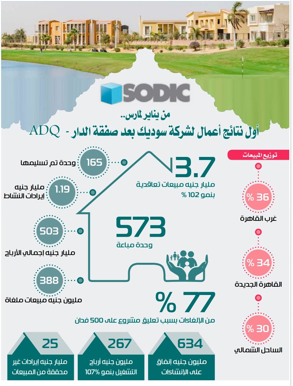 أعلنت شركة السادس من أكتوبر للتنمية والاستثمار «سوديك» عن نتائج أعمالها الخاصة بالربع الأول من العام الجاري، والتي تأتي في وقت يمثل أهمية كبيرة للشركة، إذ انها نتائج الأعمال الأولى بعد إتمام صفقة استحواذ تحالف الدار الإماراتية – ADQ على نحو 85.5% من أسهم شركة سوديك، وهو ما دفعنا لاستعراض أبرز الأرقام التي جاءت في إفصاح الشركة من خلال الإنفوجراف الآتي..