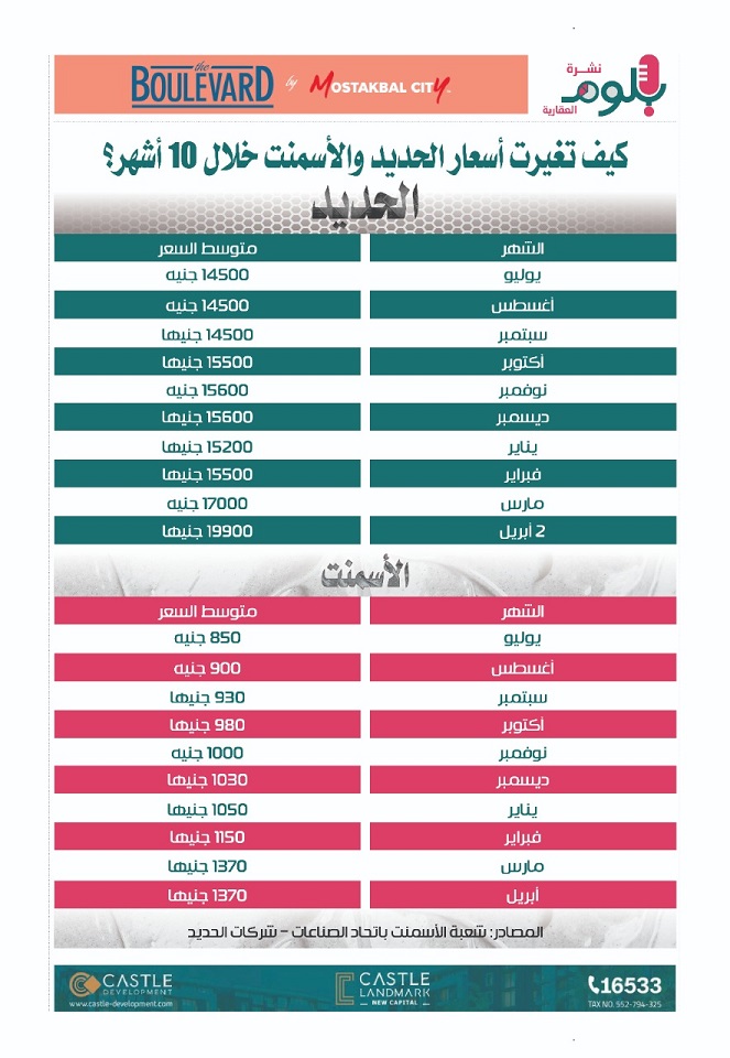 طرأت تغيرات كبيرة خلال الأسابيع الماضية على أسعار الحديد والأسمنت، والتي أثرت بقوة على النشاط العقاري في مصر، وهو ما دفعنا في الانفوجراف الآتي إلى استعراض تطور أسعار الحديد والأسمنت على مدار الأشهر العشرة الماضية، منذ بداية العام المالي الجاري، مرورا ببدء أزمة التضخم العالمي، ثم الاضطرابات التي نجمت عن الحرب الروسية الأوكرانية.