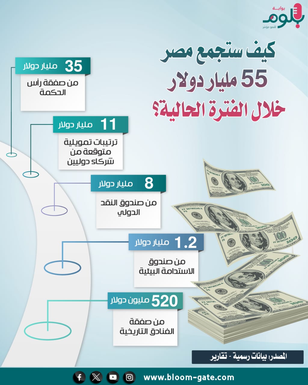 ركزت مصر خلال الأسابيع الماضية على تعزيز السيولة الدولارية لديها من خلال إتمام الاتفاق مع صندوق النقد الدولي على رفع قيمة برنامج التمويل من 3 إلى 8 مليارات دولار، وكذلك الاتفاق مع عدة جهات على تمويلات أخرى، وسبق كل ذلك توقيعها صفقة رأس الحكمة الضخمة، وفي الإنفوجراف الآتي سوف نستعرض خطة مصر لجمع 55 مليار دولار بالفترة الحالية..