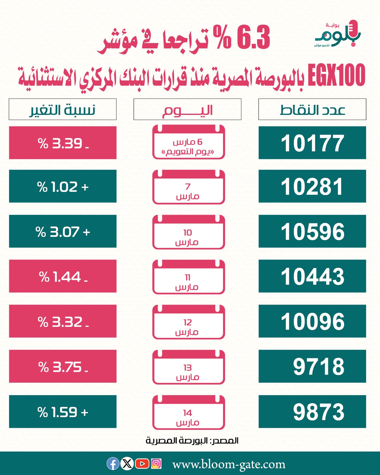 مؤشر EGX100 في البورصة المصرية يتراجع 6.3% منذ التعويم.. إنفوجراف