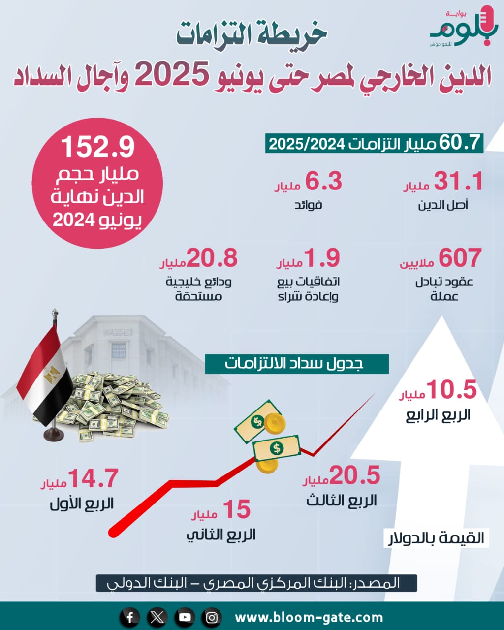 تضع وزارة المالية على رأس أولوياتها السيطرة على الدين الخارجي الذي يتصدر أهم القضايا للاقتصاد المصري، وكشف أحمد كجوك وزير المالية في حديثه أمام مجلس النواب هذا الأسبوع عن إن حجم الدين الخارجي لأجهزة الموازنة انخفض بنحو 4 مليارات دولار خلال العام الماضي، ويستعرض الإنفوجراف التالي وضع الدين الخارجي لمصر والالتزامات المقرر سدادها خلال العام المالي الراهن.