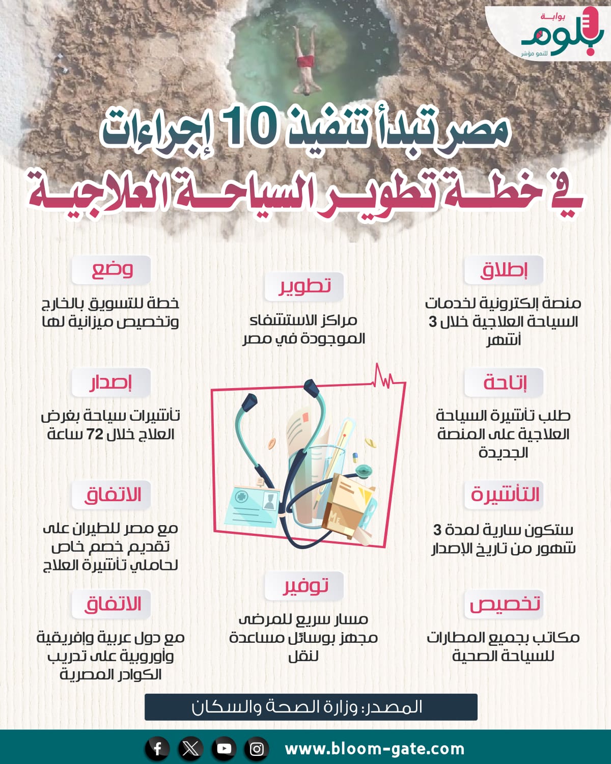 وتتمتع مصر بالعديد من المناطق الواعدة التي تلقى رواجا من الزائرين بغرض الاستشفاء، إذ ان لكل منها مزايا طبيعية تساعد على علاج أمراض بعينها، غالبيتها تخص العظام والروماتيزم والجهاز الهضمي والأمراض العصبية، من خلال الرمال والمياه المصرية والشعب المرجانية وكهوف الملح والتي تقوم بعلاج الكثير من الأمراض، وفي الإنفوجراف الآتي سوف نستعرض أبرز 6 مناطق في مصر مؤهلة لجذب زوار جدد عبر السياحة العلاجية.