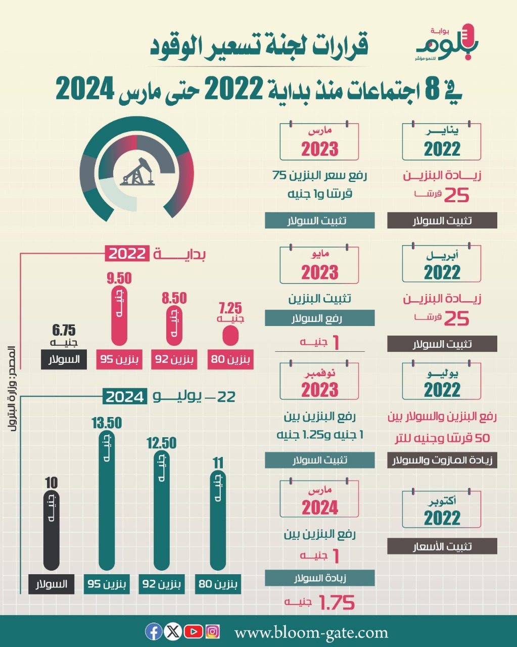 وشهدت أسعار الوقود تغيرات كبيرة على مدار الأعوام الماضية، وتحديدا منذ بداية العام 2022، وحتى الاجتماع الأخير في مارس الماضي، إذ تزامنت تلك الاجتماعات مع ضغوط اقتصادية كبيرة مرت على مصر، مع تفاقم الاضطرابات العالمية، والقفزات المستمرة في معدلات التضخم ونقص العملات الصعبة، والذي دفع لجنة تسعير الوقود في تلك الفترة إلى رفع الأسعار في 7 اجتماعات وتثبيتها في اجتماع واحد فقط، وفي الإنفوجراف الآتي سوف نستعرض تلك القرارت.