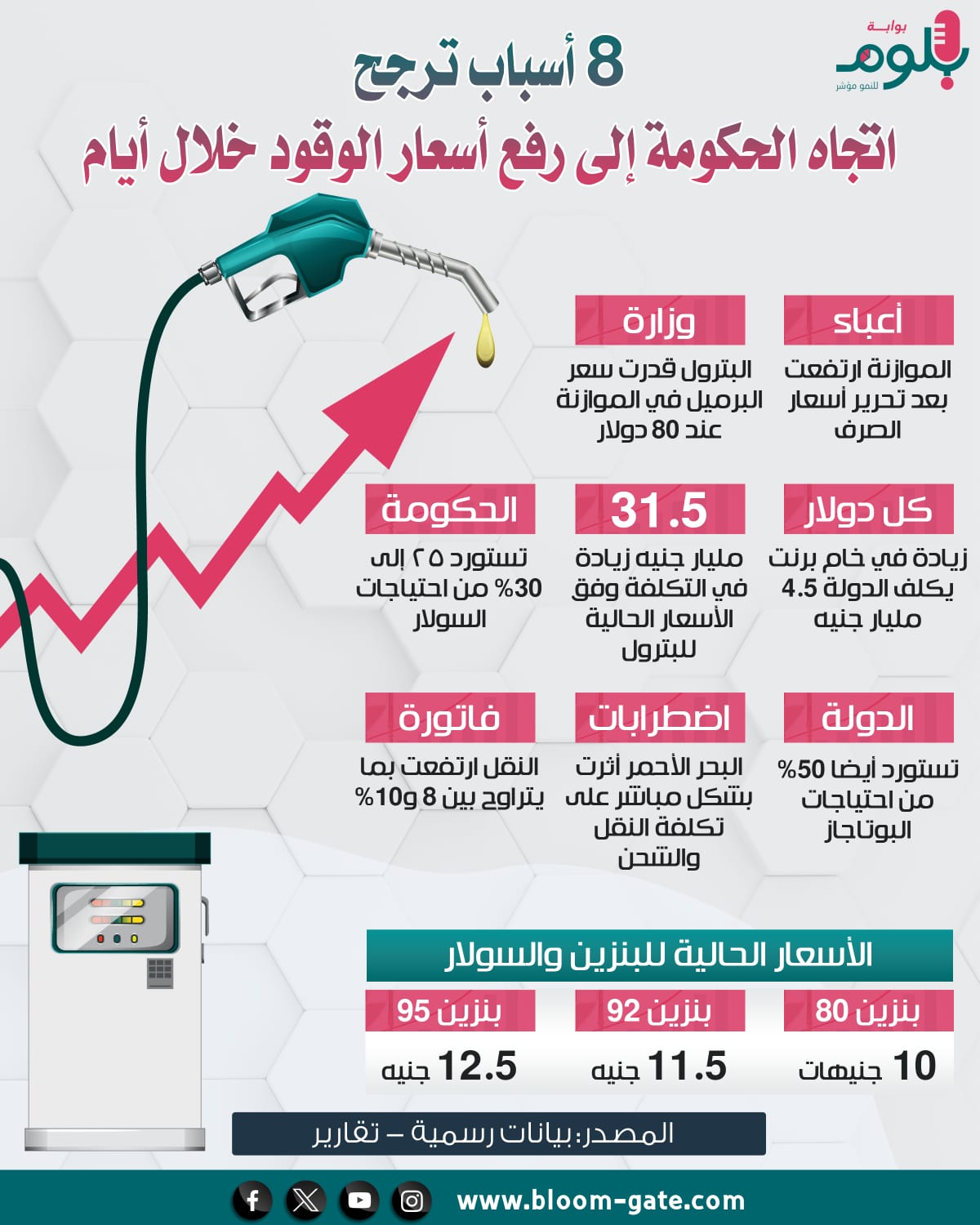 ورفعت لجنة تسعير المواد البترولية بمصر، في 3 نوفمبر الماضي، أسعار البنزين بكافة أنواعه ونشرت الجريدة الرسمية قرارا يتضمن زيادة أسعار البنزين 80 إلى 10 جنيهات من 8.75 جنيه، والبنزين 92 إلى 11.5جنيه من 10.25 جنيه، والبنزين 95 إلى 12.5 جنيه من 11.2 جنيه، وفي الإنفوجراف الآتي سوف نستعرض الأسباب التي ترجح رفع أسعار البنوين والسولار.