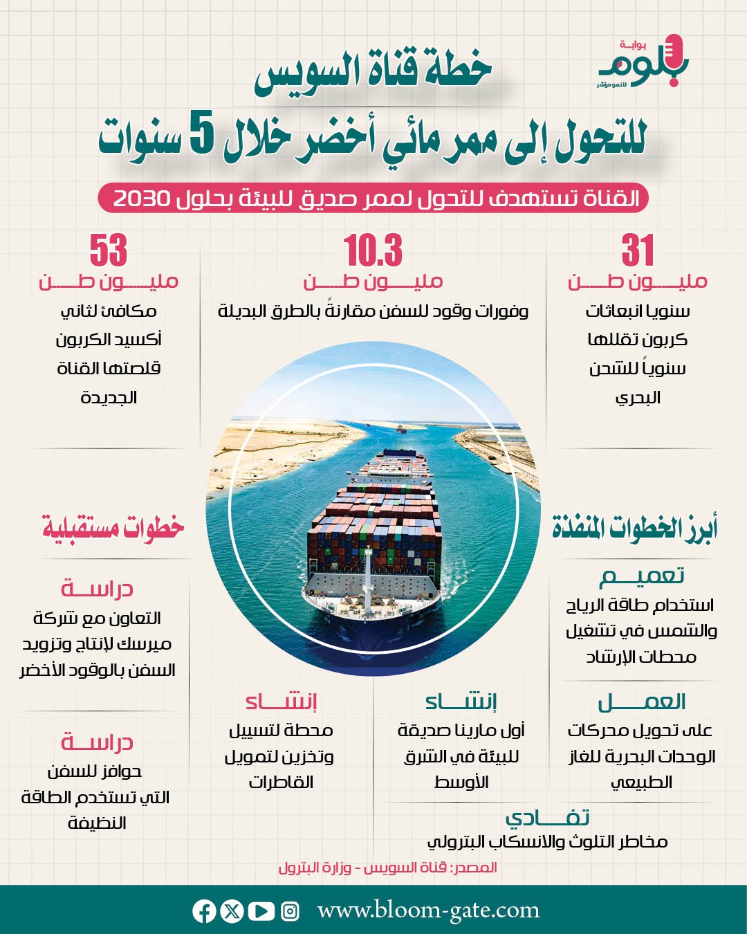 تسعى قناة السويس إلى التحول إلى قناة خضراء صديقة للبيئة بحلول عام 2030، عبر تبني ممارسات تستهدف خفض انبعاثات الكربون الناجمة عن الشحن البحري، وتشجيع التوجه نحو استخدام الوقود النظيف المحايد للكربون التزاماً بتوجيهات المنظمة البحرية الدولية (IMO)، ونستعرض في هذا الأنفوجراف أبرز الخطوات التي اتخذتها هيئة قناة في هذا الصدد.