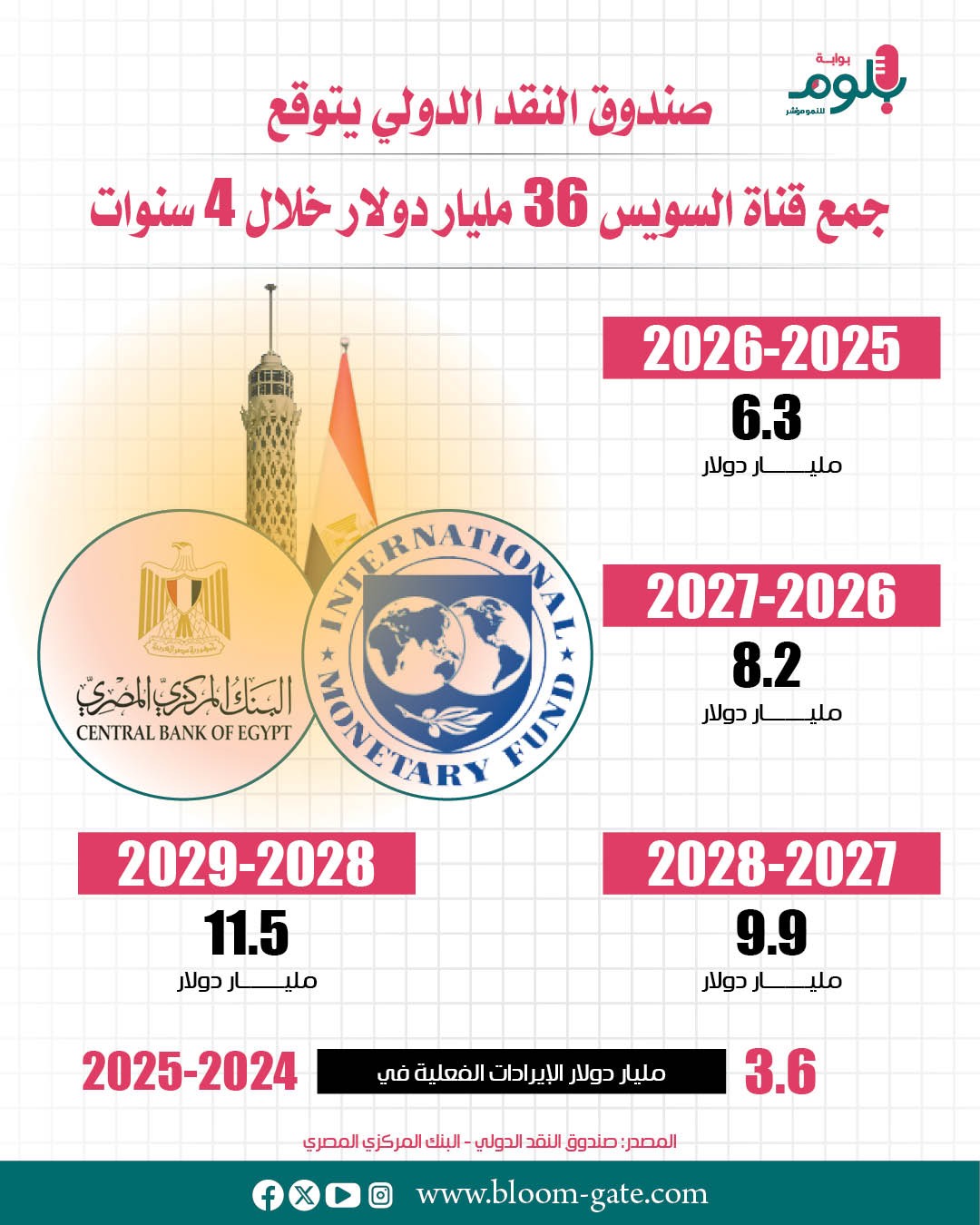 فيما أبدى صندوق النقد الدولي نظرة متفائلة إزاء مستقبل عائدات قناة السويس، والتي تتزامن مع هدوء الأوضاع الأمنية في باب المندب والبحر الأحمر، حيث رجحت المؤسسة الدولية تعافي نشاط الملاحة في القناة سريعاً اعتباراً من العام الجاري، ثم تنمو تدريجياً حتى تسجل مستوى غير مسبوق من الإيرادات خلال 3 سنوات، وللتعرف على هذه التوقعات يمكنك الاطلاع على هذا الإنفوجراف.