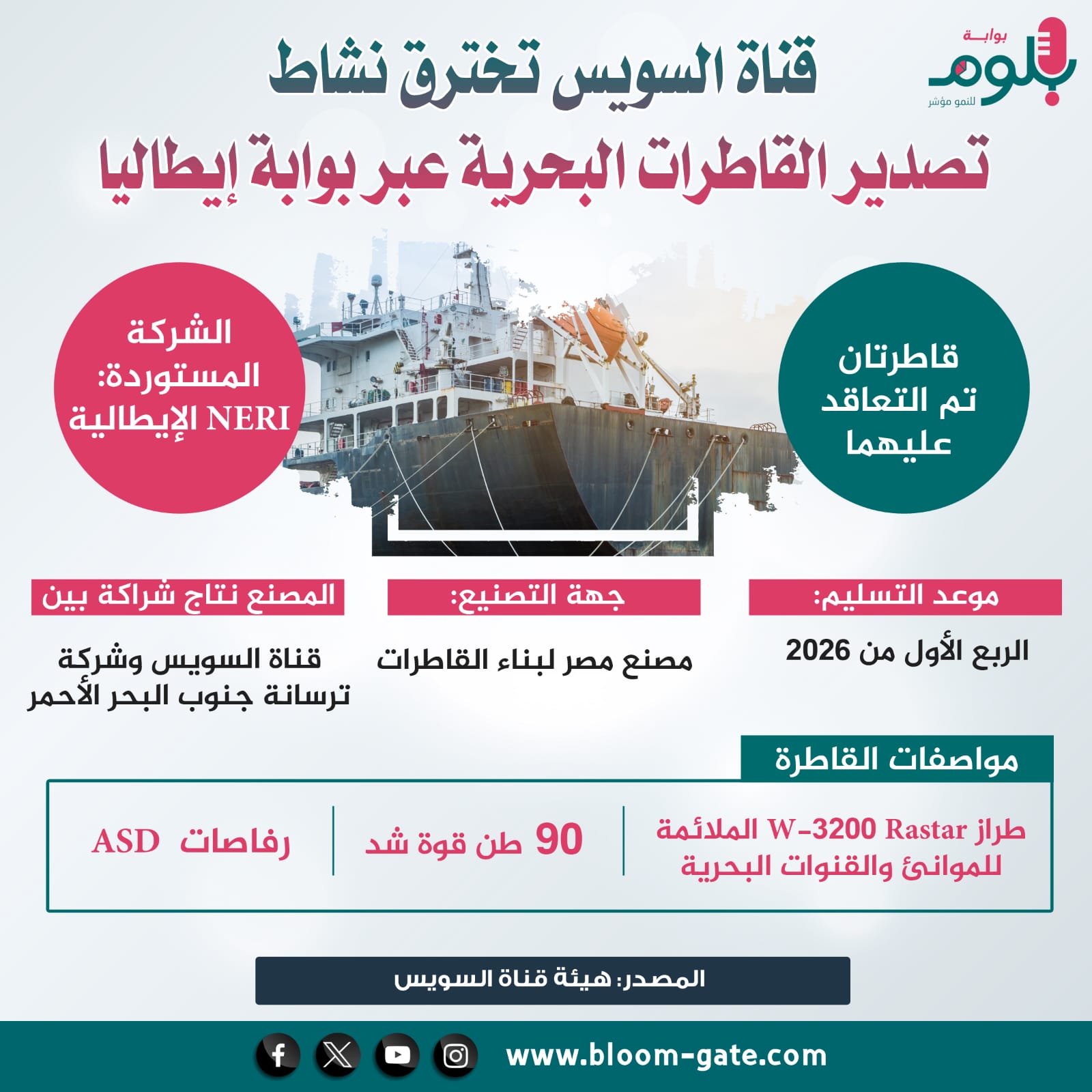 في خطوة هي الأولى من نوعها، وقعت شركة قناة السويس للقوارب الحديثة التي تشارك هدبها هيئة قناة السويس عقد بناء وتصدير قاطرتين لصالح مجموعة NERI الإيطالية العامل في مجال الخدمات البحرية، وهو ما يفتح مجالاً لتصدير الوحدات البحرية للخارج بعد النجاح في توطين صناعة القاطرات البحرية التي تعد قطعة بحرية أساسية في نشاط الموانىء حول العالم، وخلال هذا الإنفوجراف سنتعرف على تفاصيل القاطرة المتعاقد عليها وأبرز بنود التعاقد.