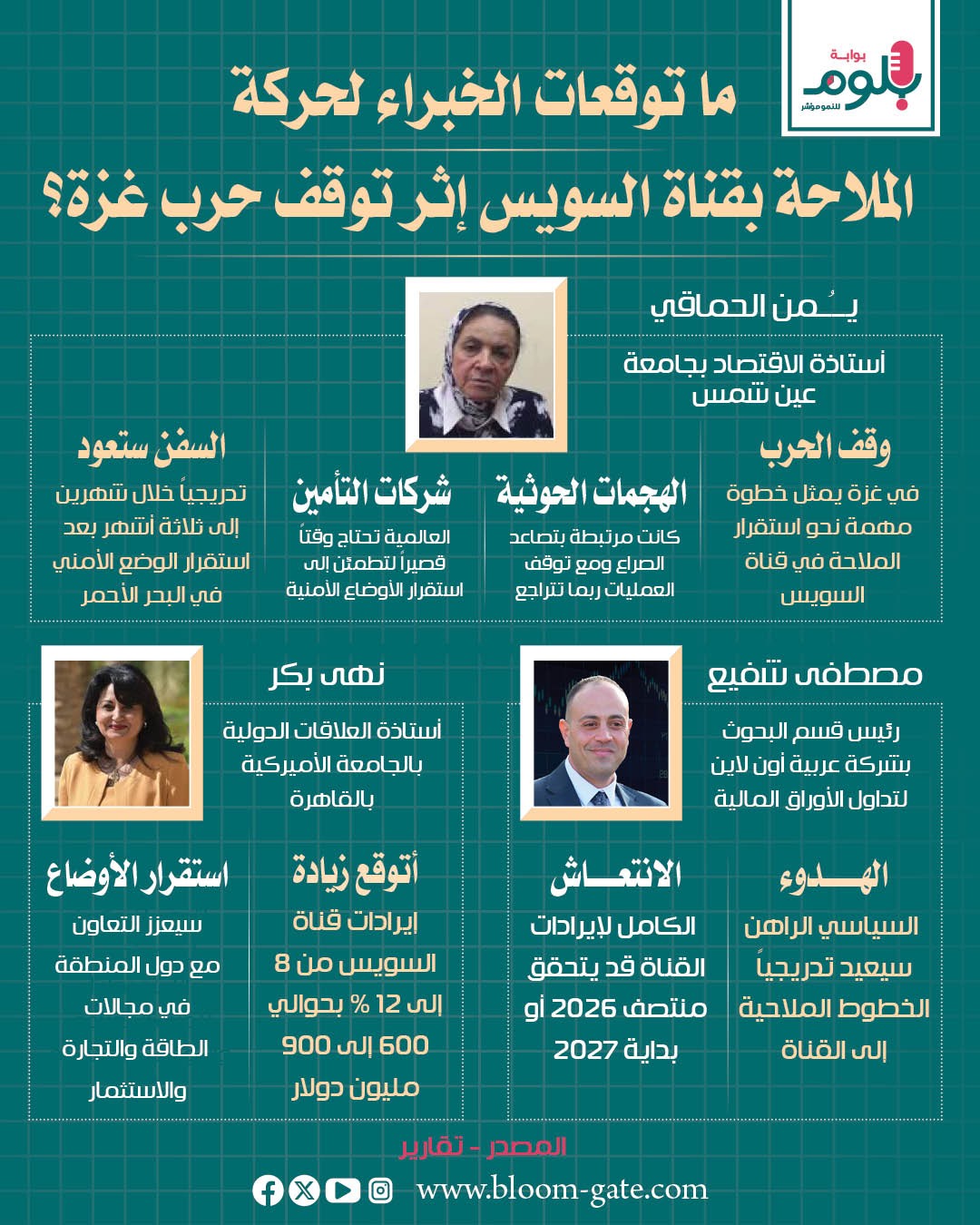 يرى خبراء الاقتصاد أن وقف الحرب الإسرائيلية في غزة سيفتح الباب أمام عودة إيرادات قناة السويس إلى نشاطها المعتاد، ولكن لن تكتسب الزخم المعتاد فوراً بل ستحتاج إلى مزيد من الوقت حتى تطمئن شركات الشحن لمستويات الأمن والسلامة في البحر الأحمر، ثم تعديل جداول الإبحار ومساراتها، وهي العملية التي تستغرق عدة أشهر، ويتناول الإنفوجراف الآتي توقعات الخبراء لمستقبل حركة الملاحة في قناة السويس.